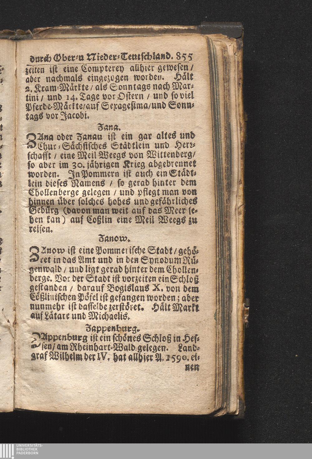Der getreue Reiß-Gefert durch Ober- und Nieder-Teutschland : Das ist: Grundrichtige und ausführliche Abhandlung derer jenigen Residenzien/ Städte/ Schlösser/ Vestungen/ Städtlein und nahmhafften Markflecken/ welche so wol in Ober- als Nieder-Teutschland/ einem Reisenden sich hin und wieder vorstellig machen und zwar solcher Gestalt/ daß darinn derer Ursprung/ Aufnahm/ Fortification/ Raritäten/ herrliche Gebäue/ und Glück- und Unglücks-Fälle bis auf gegenwärtige Zeit fortgesetzt enthalten. Dabey auch noch über das ein absonderlicher kurz-gefasster Weegweiser angehänget zu finden/ worinnen klärlich zu sehen, wie viel Meilen ein Ort von dem andern entlegen. Alles aus denen bewährtesten Scribenten hervorgesuchet/ zum Nutz-Ergötzen mitgetheilet ...