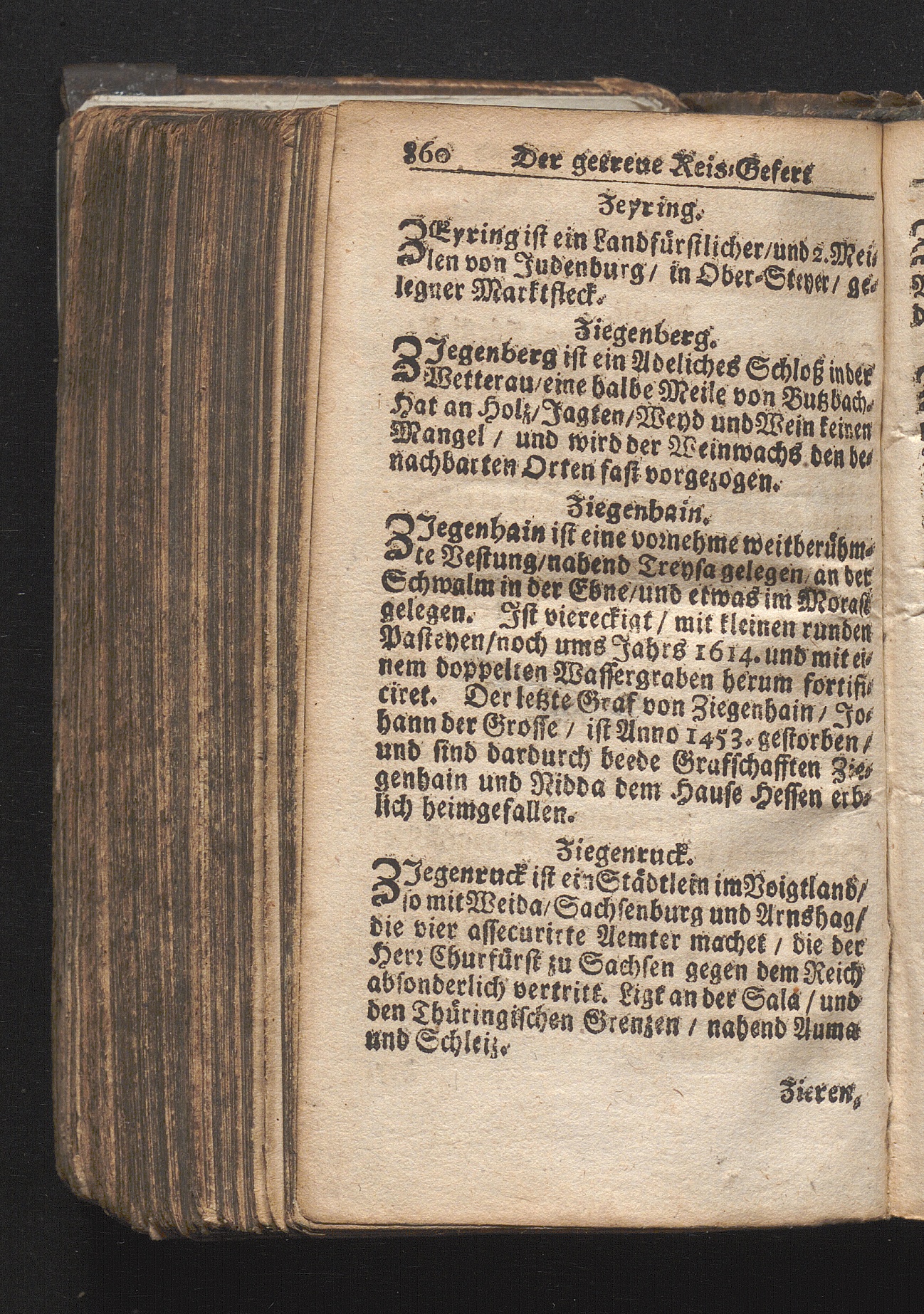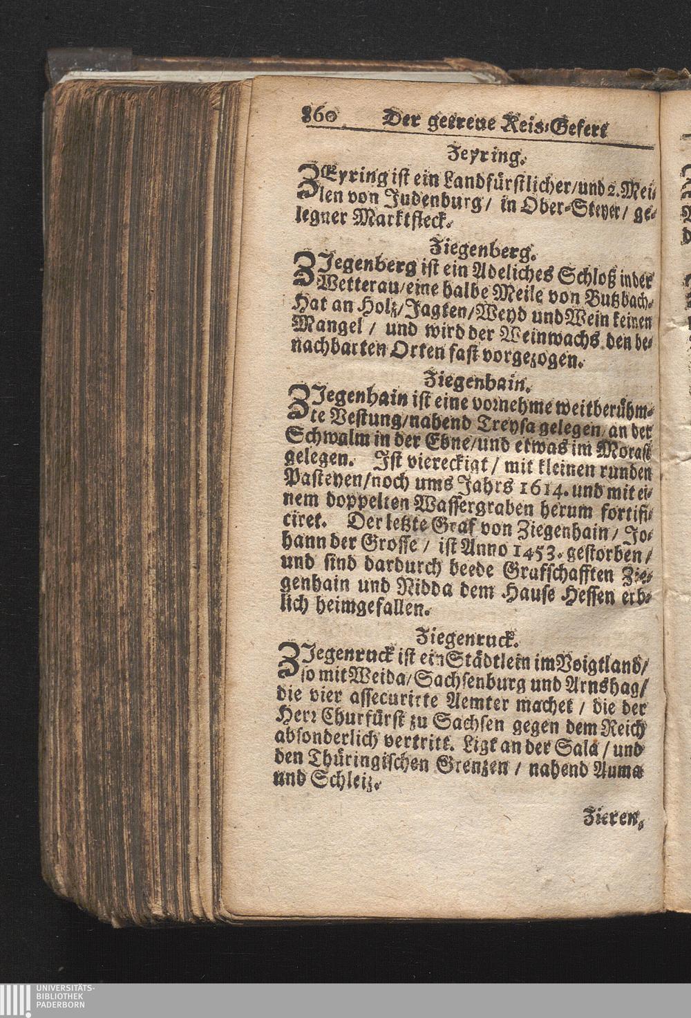 Der getreue Reiß-Gefert durch Ober- und Nieder-Teutschland : Das ist: Grundrichtige und ausführliche Abhandlung derer jenigen Residenzien/ Städte/ Schlösser/ Vestungen/ Städtlein und nahmhafften Markflecken/ welche so wol in Ober- als Nieder-Teutschland/ einem Reisenden sich hin und wieder vorstellig machen und zwar solcher Gestalt/ daß darinn derer Ursprung/ Aufnahm/ Fortification/ Raritäten/ herrliche Gebäue/ und Glück- und Unglücks-Fälle bis auf gegenwärtige Zeit fortgesetzt enthalten. Dabey auch noch über das ein absonderlicher kurz-gefasster Weegweiser angehänget zu finden/ worinnen klärlich zu sehen, wie viel Meilen ein Ort von dem andern entlegen. Alles aus denen bewährtesten Scribenten hervorgesuchet/ zum Nutz-Ergötzen mitgetheilet ...