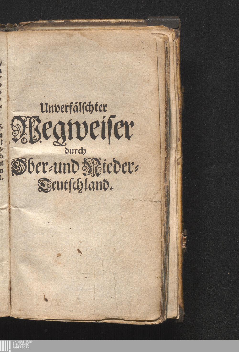 Der getreue Reiß-Gefert durch Ober- und Nieder-Teutschland : Das ist: Grundrichtige und ausführliche Abhandlung derer jenigen Residenzien/ Städte/ Schlösser/ Vestungen/ Städtlein und nahmhafften Markflecken/ welche so wol in Ober- als Nieder-Teutschland/ einem Reisenden sich hin und wieder vorstellig machen und zwar solcher Gestalt/ daß darinn derer Ursprung/ Aufnahm/ Fortification/ Raritäten/ herrliche Gebäue/ und Glück- und Unglücks-Fälle bis auf gegenwärtige Zeit fortgesetzt enthalten. Dabey auch noch über das ein absonderlicher kurz-gefasster Weegweiser angehänget zu finden/ worinnen klärlich zu sehen, wie viel Meilen ein Ort von dem andern entlegen. Alles aus denen bewährtesten Scribenten hervorgesuchet/ zum Nutz-Ergötzen mitgetheilet ...