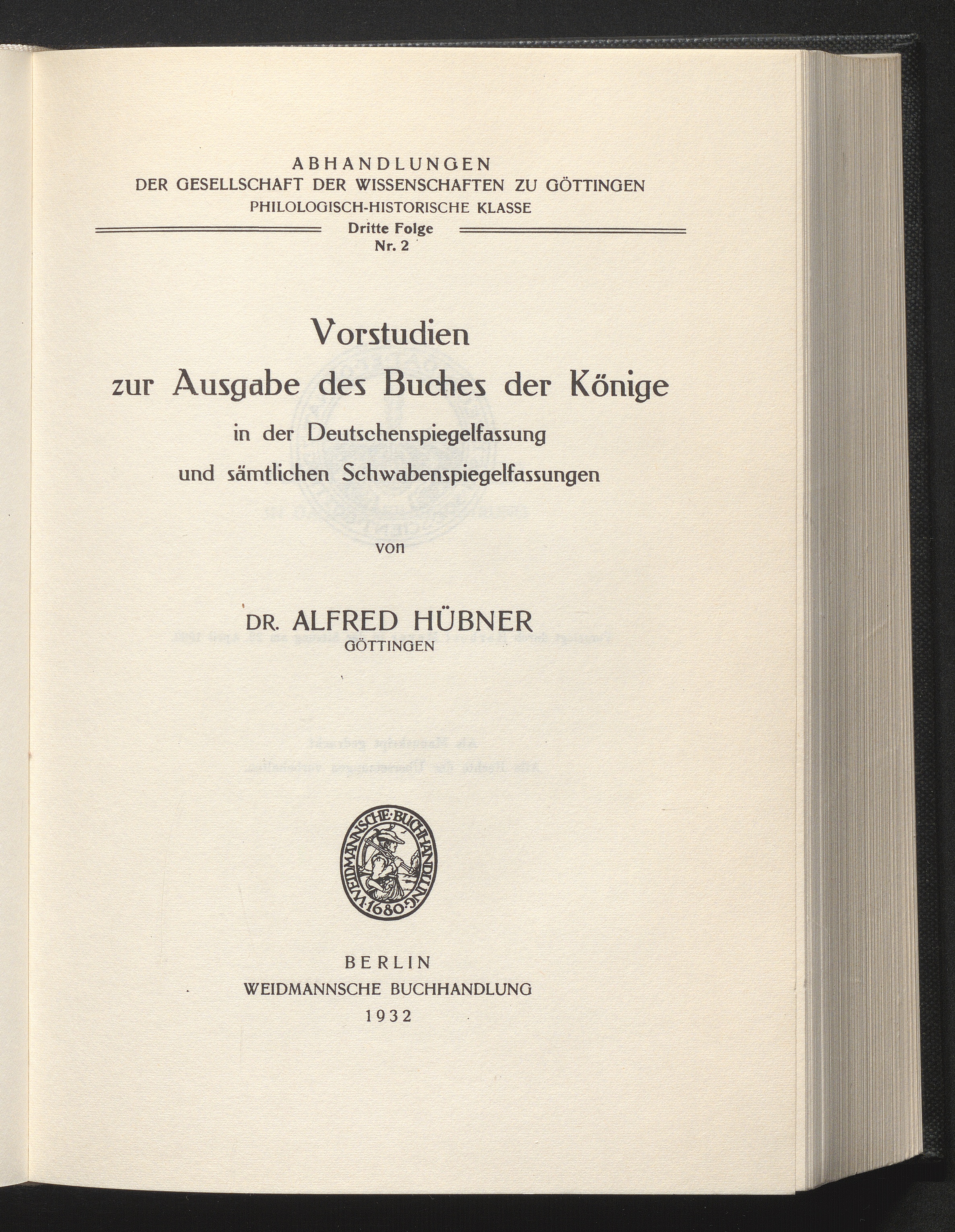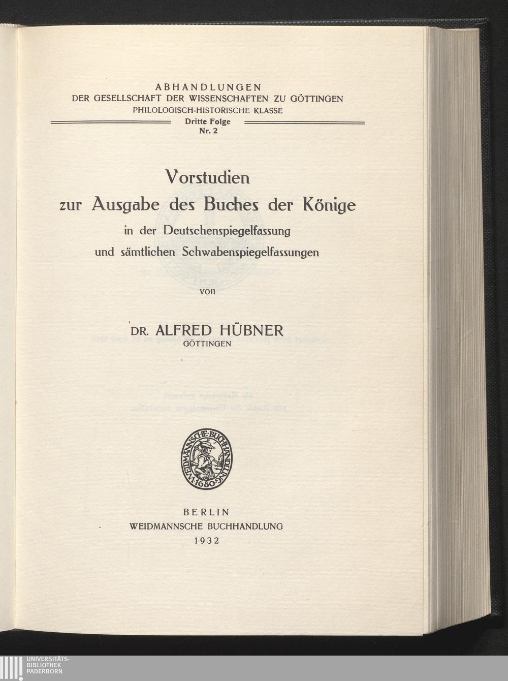 Vorstudien zur Ausgabe des Buches der Könige in der Deutschenspiegelfassung und sämtlichen Schwabenspiegelfassungen / von Alfred Hübner