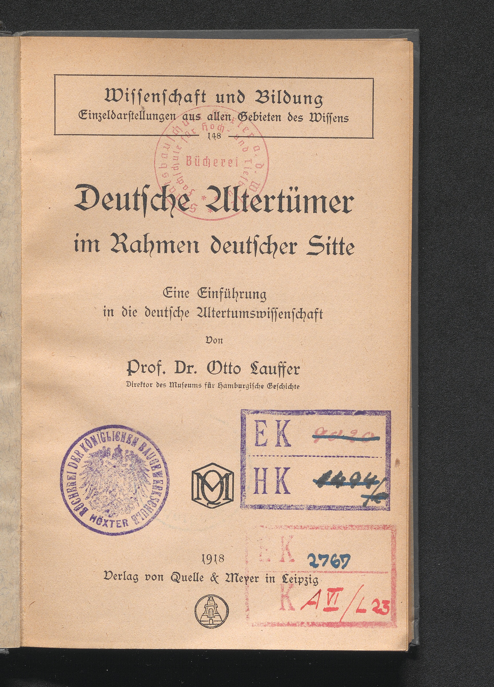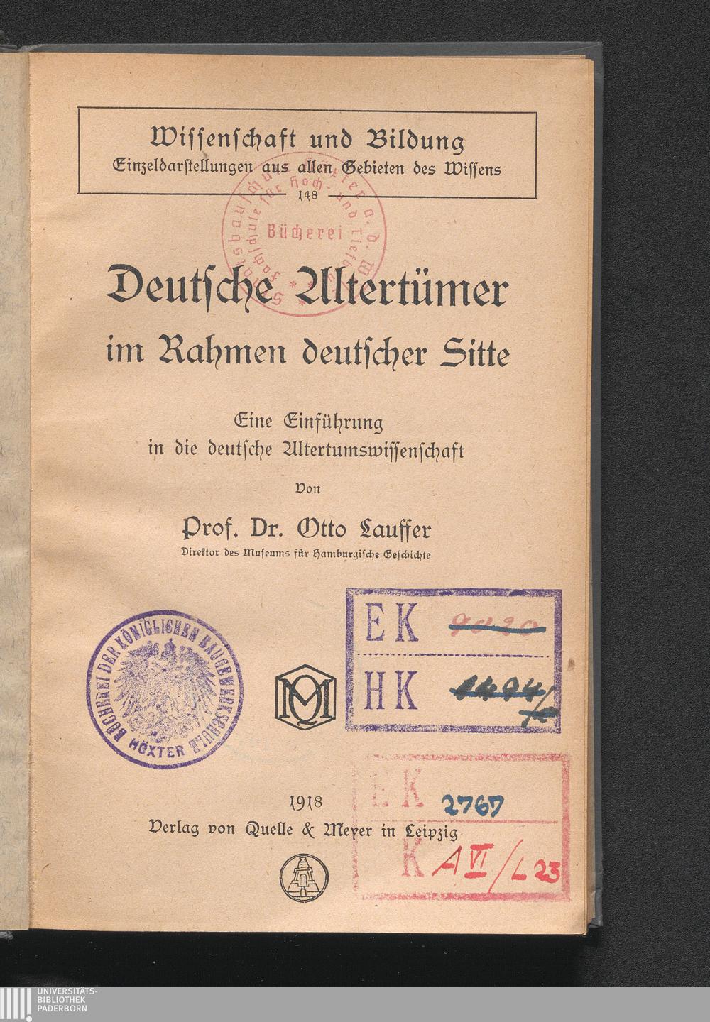 Deutsche Altertümer im Rahmen deutscher Sitte : eine Einführung in die deutsche Altertumswissenschaft / von Otto Lauffer