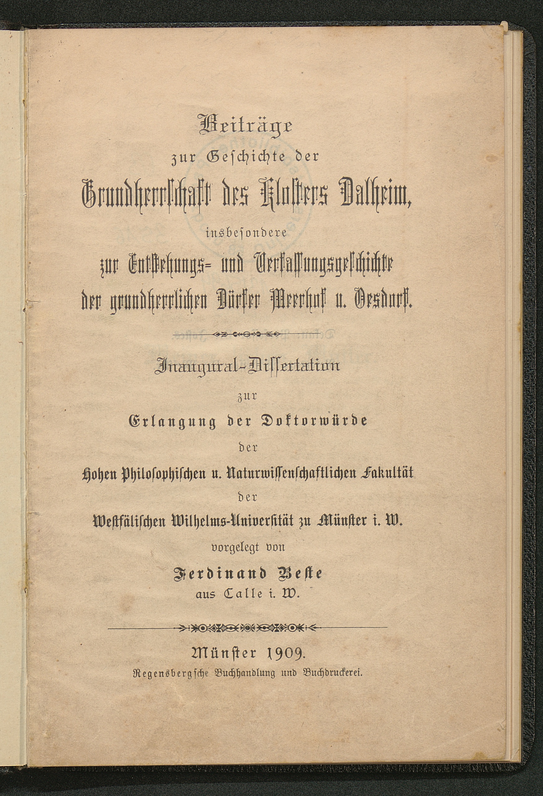 Beiträge zur Geschichte der Grundherrschaft des Klosters Dalheim, insbesondere zur Entstehungs- und Verfassungsgeschichte der grundherrlichen Dörfer Meerhof und Oesdorf / vorgelegt von Ferdinand Beste