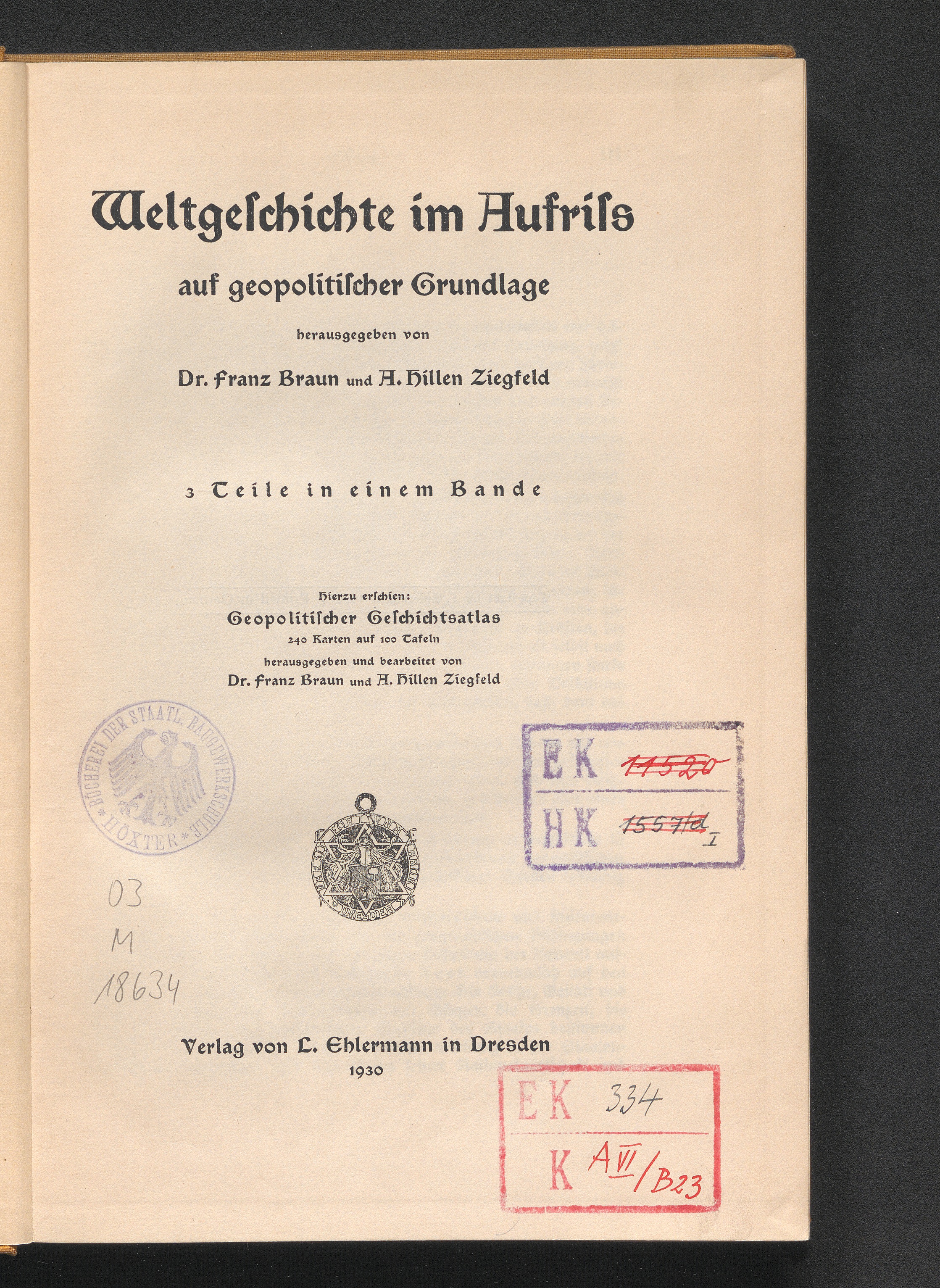 Weltgeschichte im Aufriß auf geopolitischer Grundlage : 3 Teile in einem Band / hrsg. von Franz Braun und A. Hillen Ziegfeld