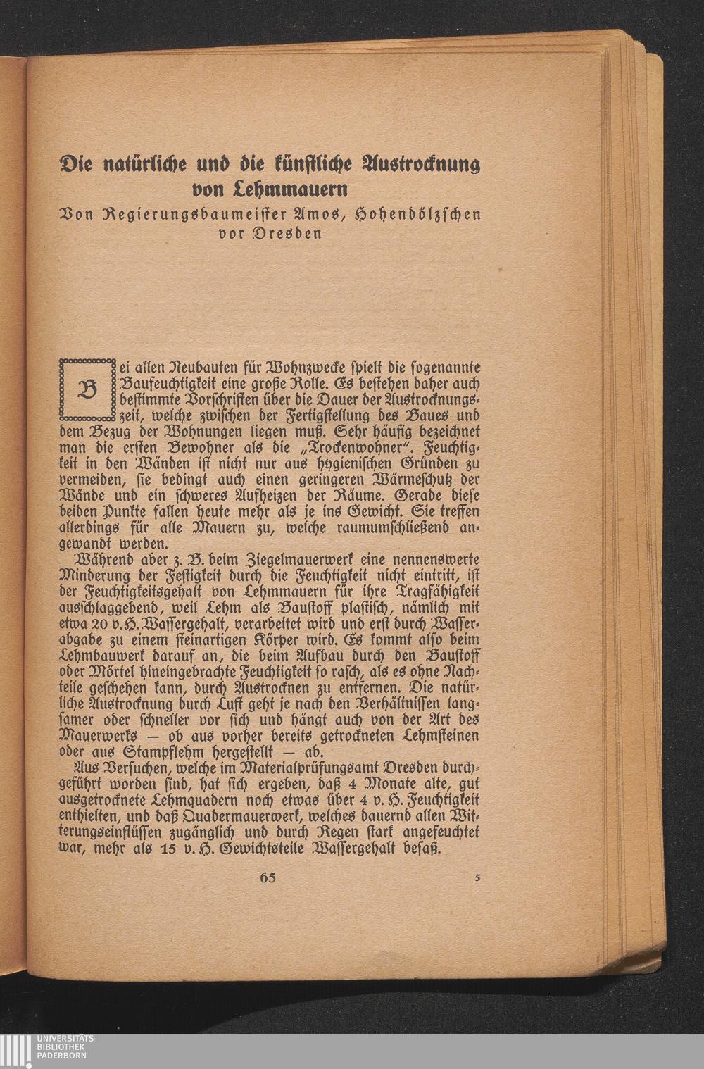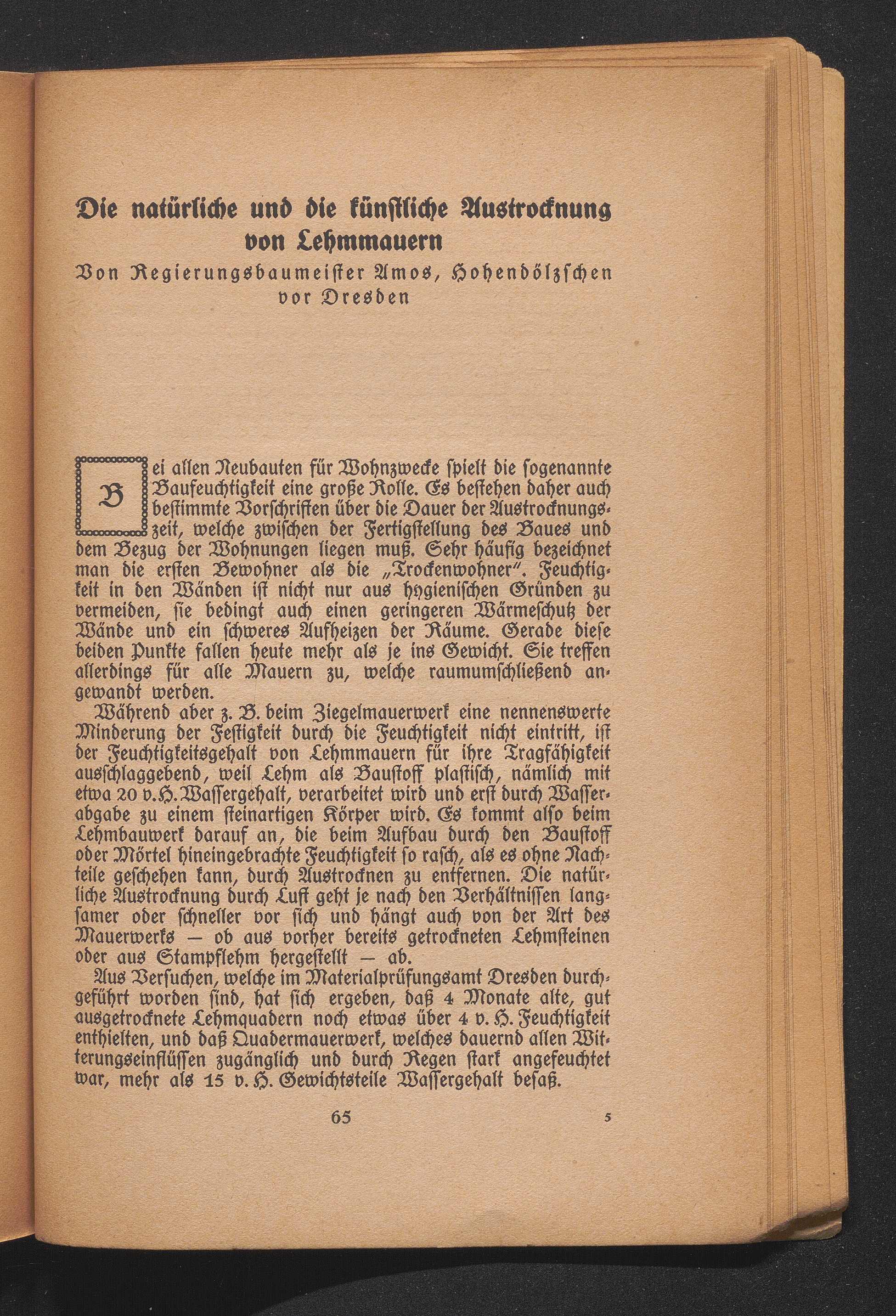 Die natürliche und künstliche Austrocknung von Lehmmauern. Von Regierungsbaumeister Amos