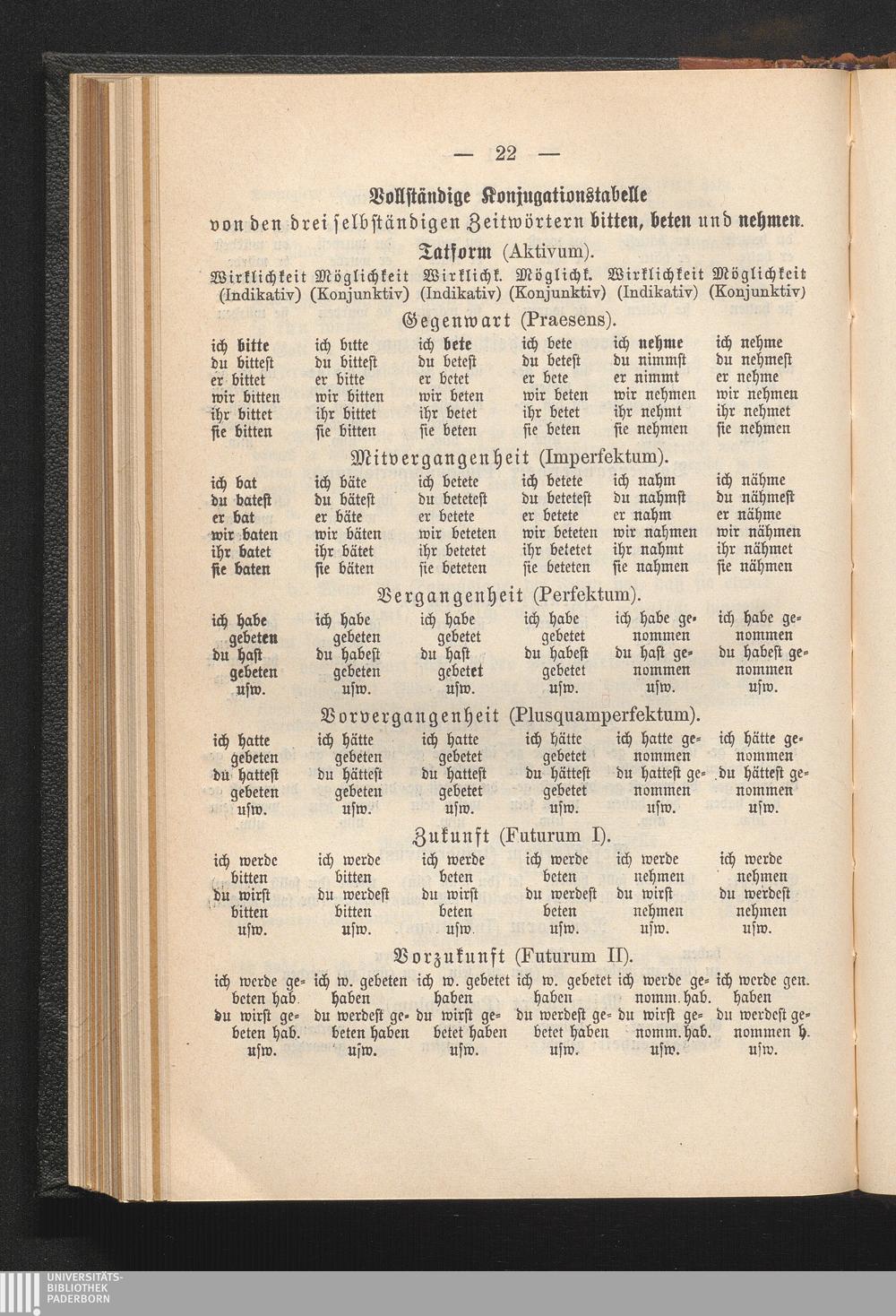 14. Vollständige Konjugationstabelle von bitten, beten, nehmen (Tatform)