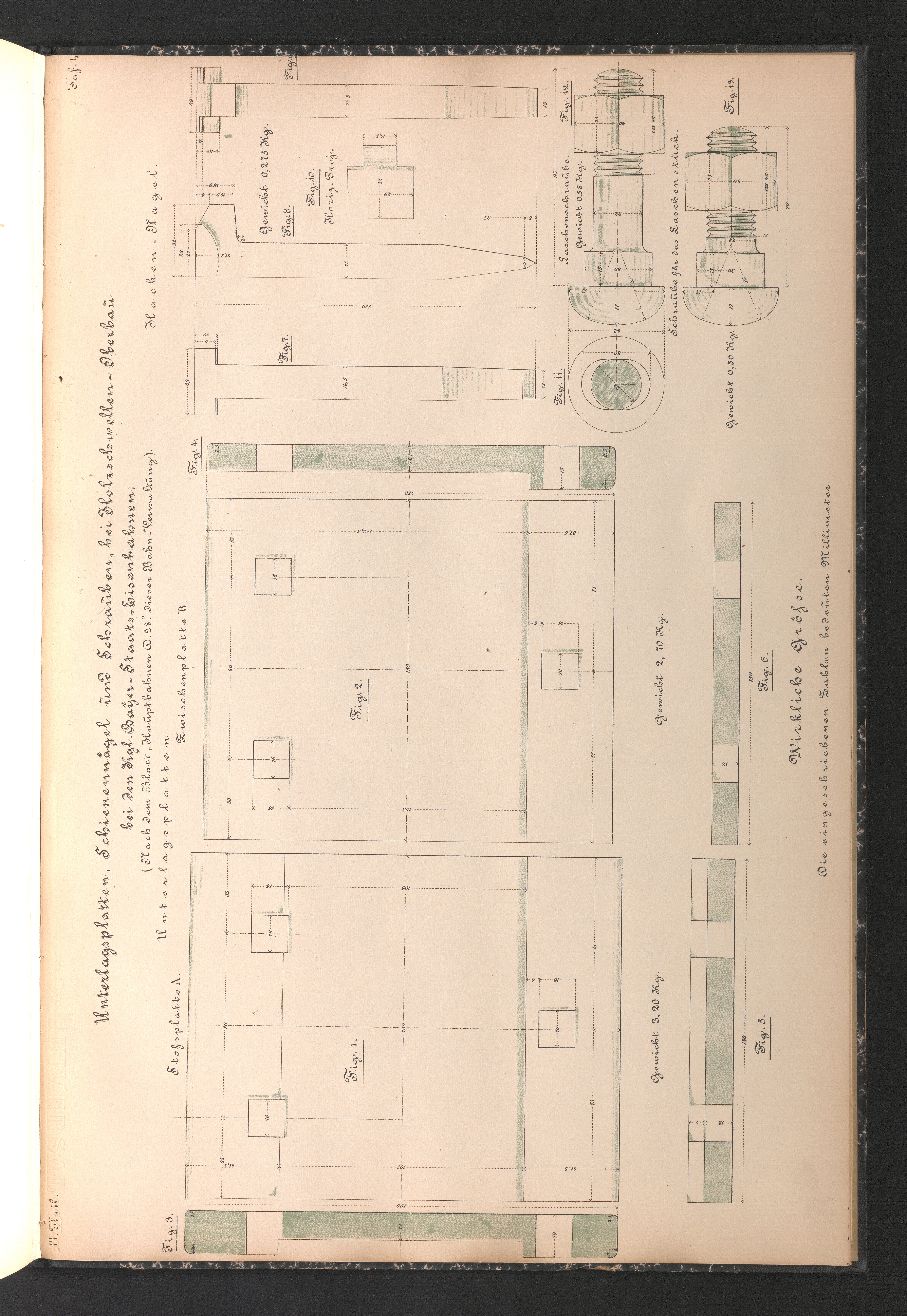 III. Theil. Taf. 4. Unterlagsplatten, Schienennägel und Schrauben, bei Holzschwellen-Oberbau bei den Kgl. Bayer- Staats-Eisenbahnen. (Nach dem Blatt "Hauptbahnen D. 28." dieser Bahn-Verwaltung).