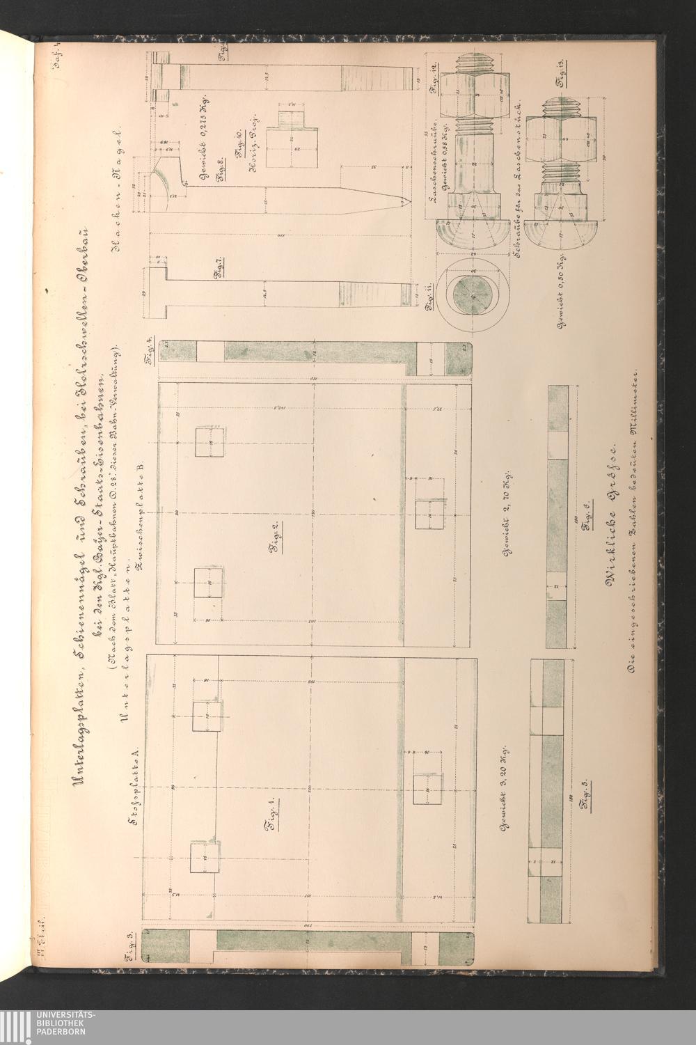 Taf. IV. Unterlagsplatten, Schienennägel und Schrauben bei Holzschwellen-Oberbau, bei den Kgl. Bayer. Staatseisenbahnen, in wirklicher Grösse