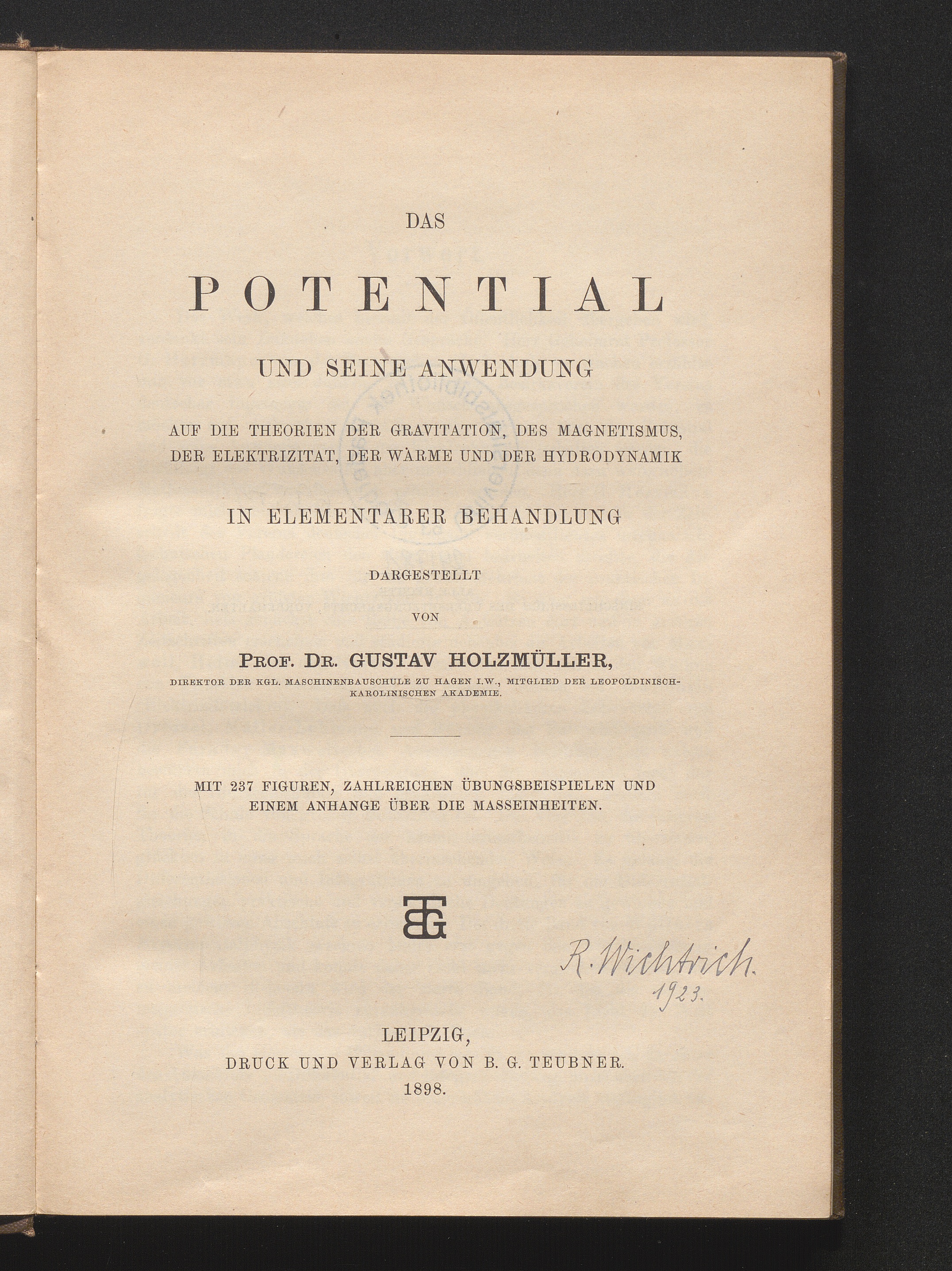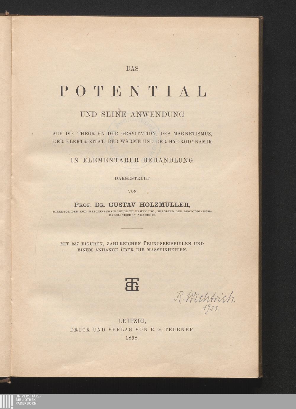 2 (1898) Das Potential und seine Anwendung auf die Theorien der Gravitation, des Magnetismus, der Elektrizitaet, der Waerme und der Hydrodynamik