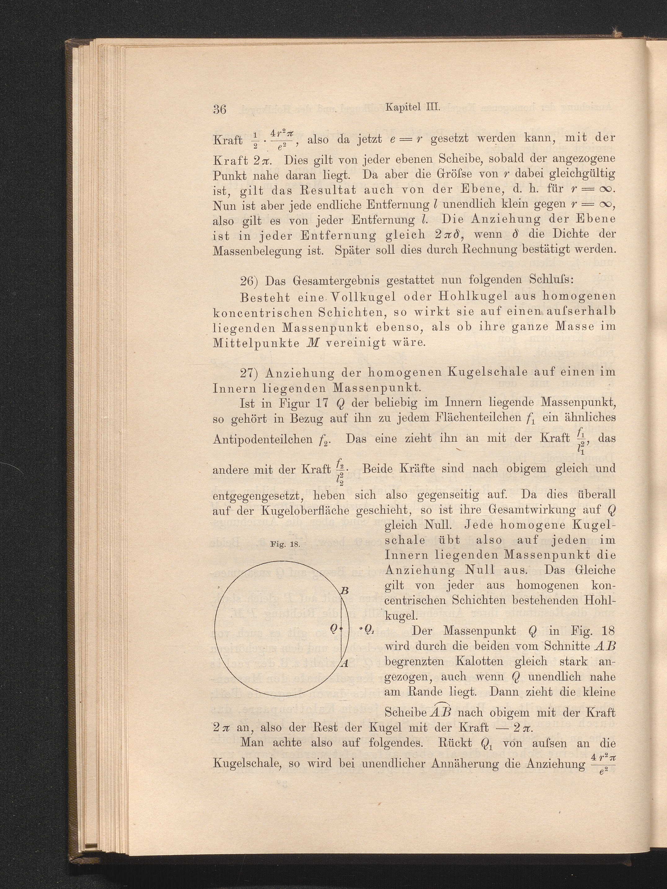 27) Anziehung der homogenen Kugelschale auf einen in Innern liegenden Massenpunk[...]
