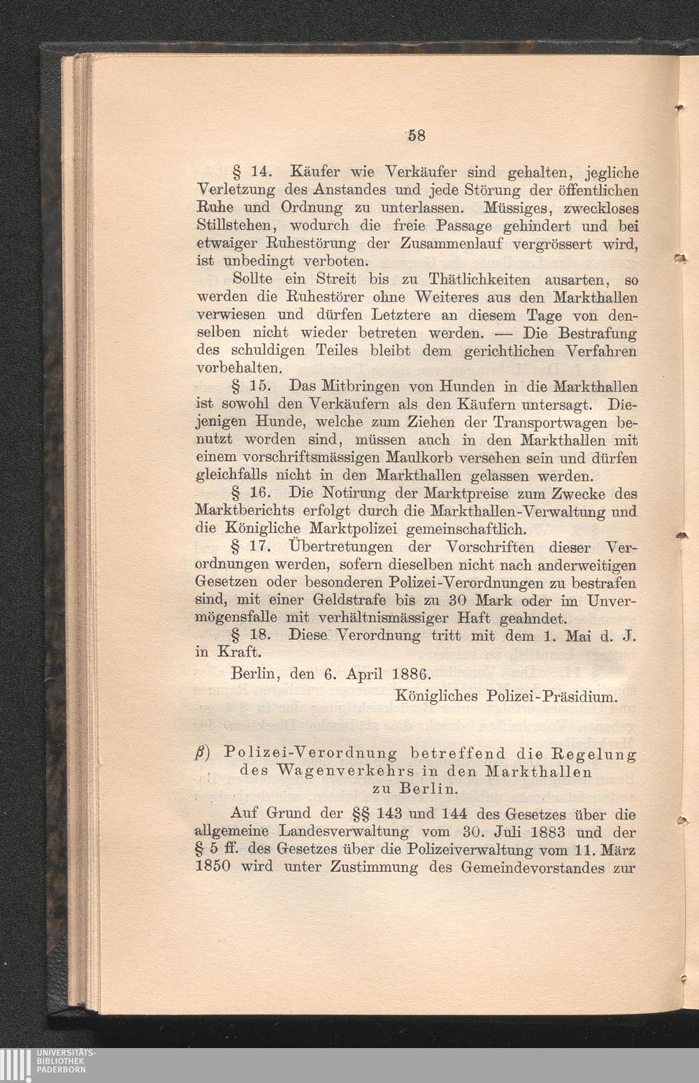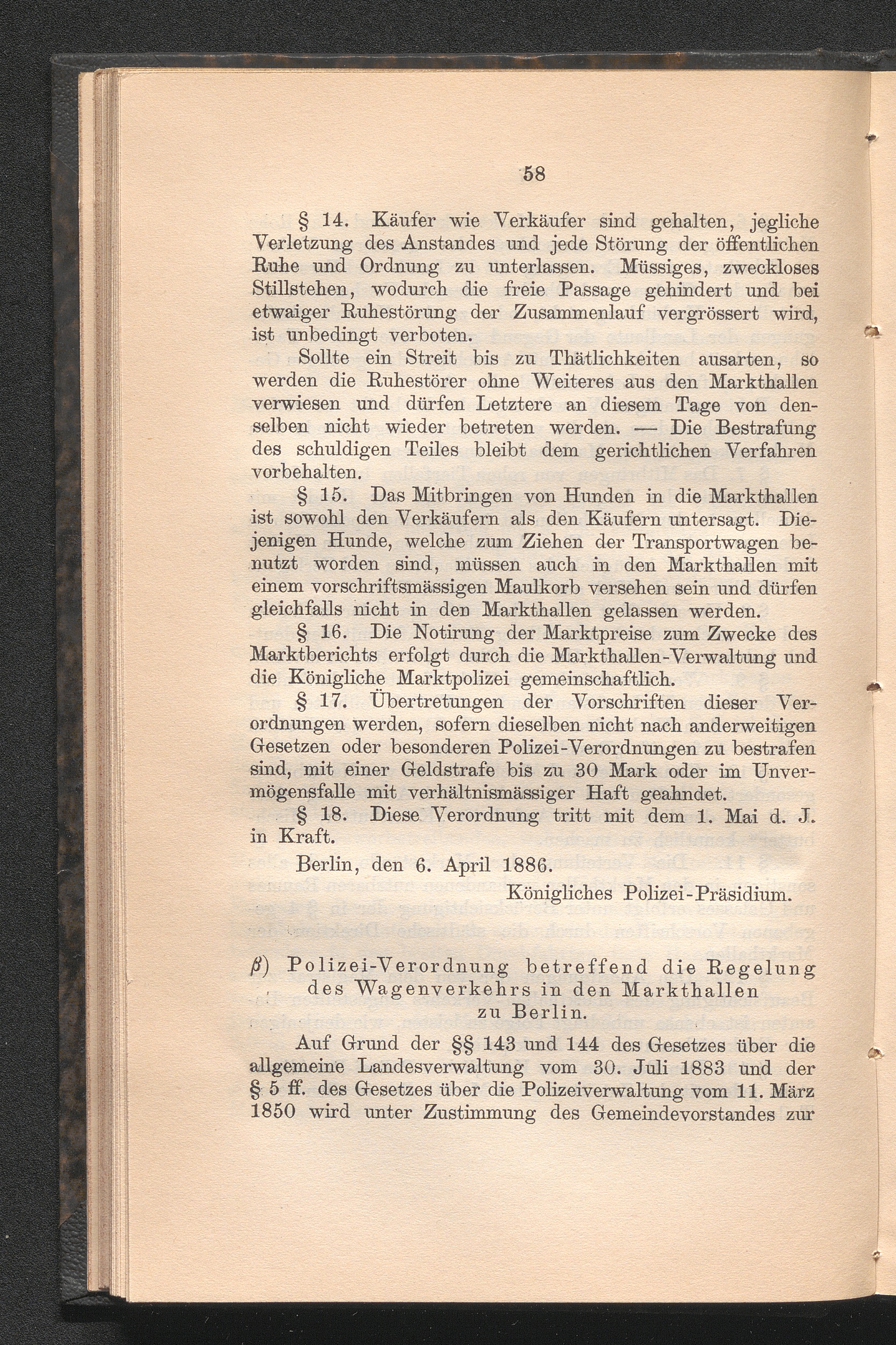 β) Polizei-Verordnung betreffend die Regelung des Wagenverkehrs in den Markthallen[...]