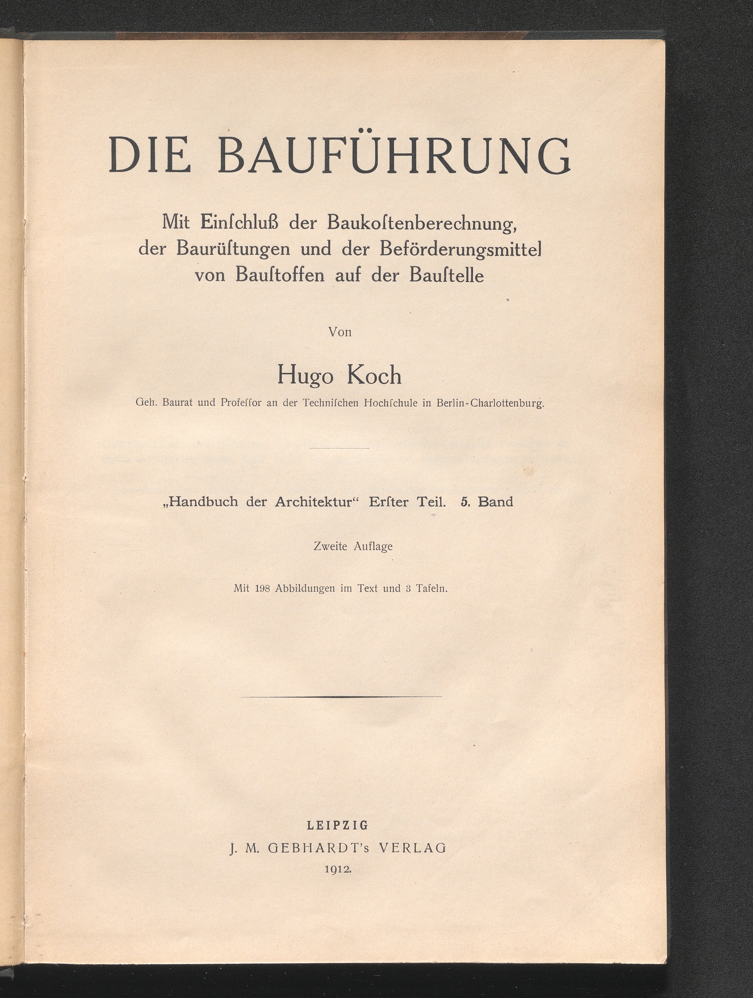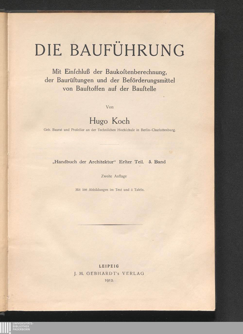Die Bauführung : mit Einschuß der Baukostenberechnung, der Baurüstungen und der Beförderungsmittel von Baustoffen auf der Baustelle ; mit 198 in d. Text eingedr. Abb., sowie 3 Taf. / Hugo Koch
