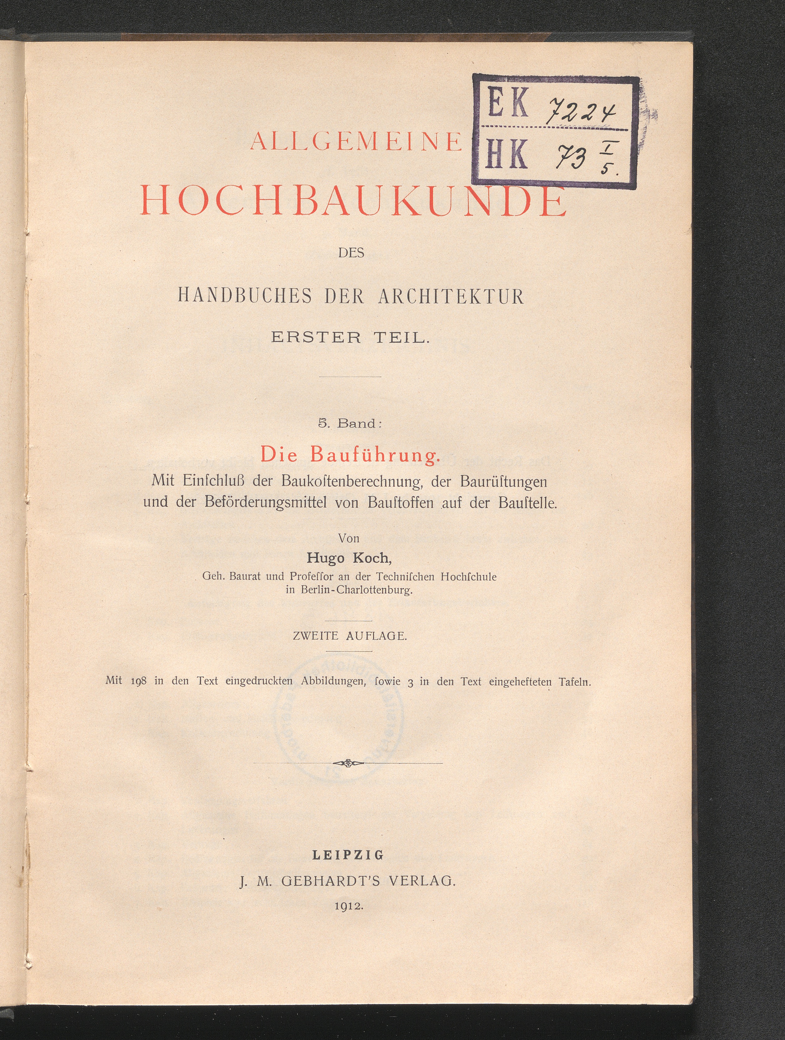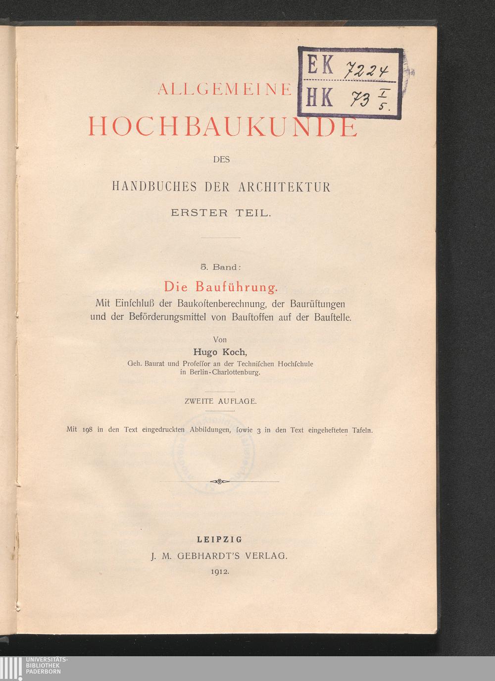 Die Bauführung : mit Einschuß der Baukostenberechnung, der Baurüstungen und der Beförderungsmittel von Baustoffen auf der Baustelle ; mit 198 in d. Text eingedr. Abb., sowie 3 Taf. / Hugo Koch