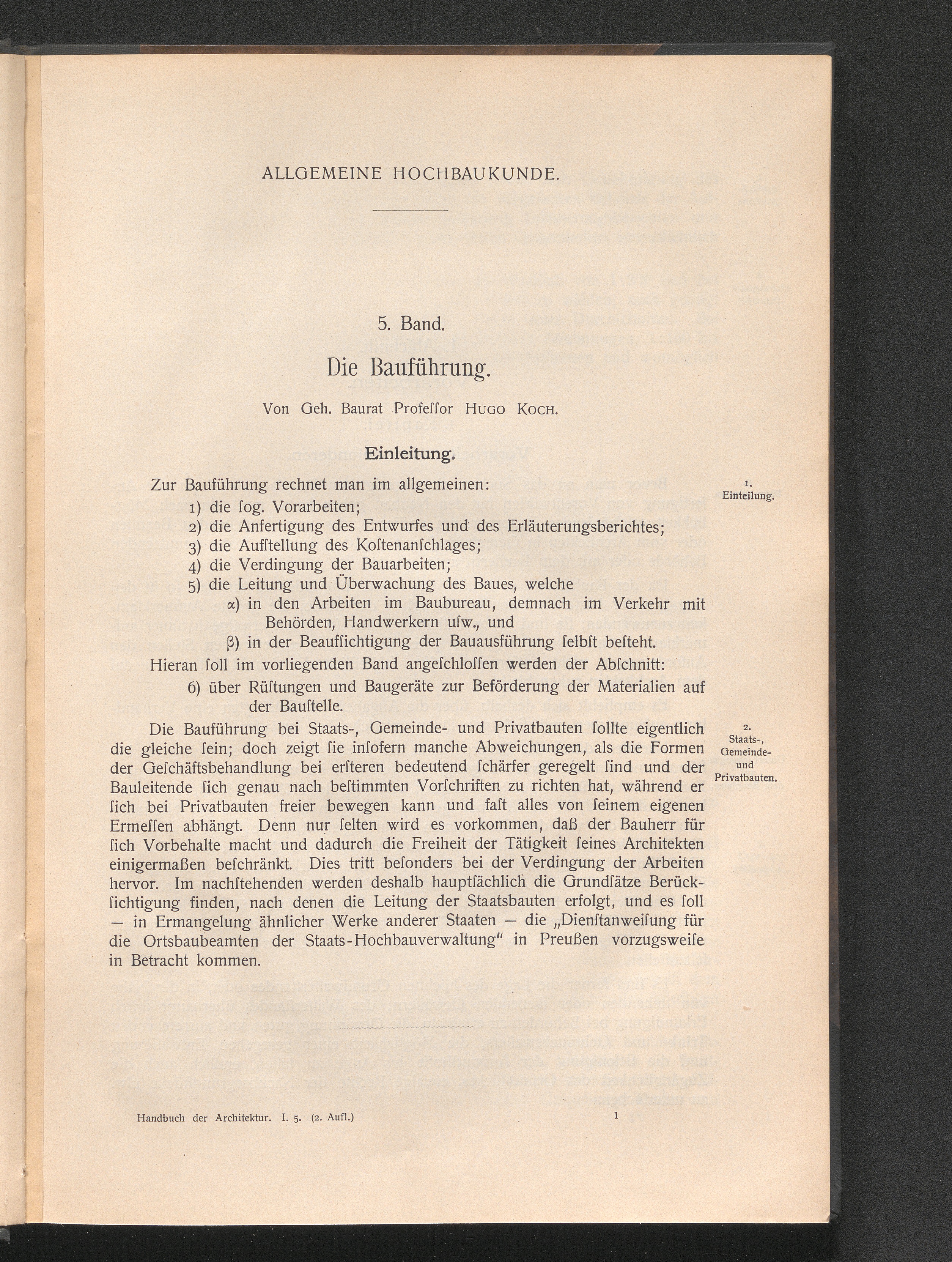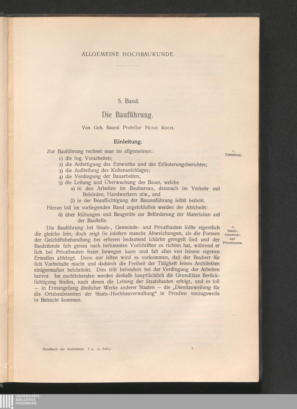 Die Bauführung : mit Einschuß der Baukostenberechnung, der Baurüstungen und der Beförderungsmittel von Baustoffen auf der Baustelle ; mit 198 in d. Text eingedr. Abb., sowie 3 Taf. / Hugo Koch
