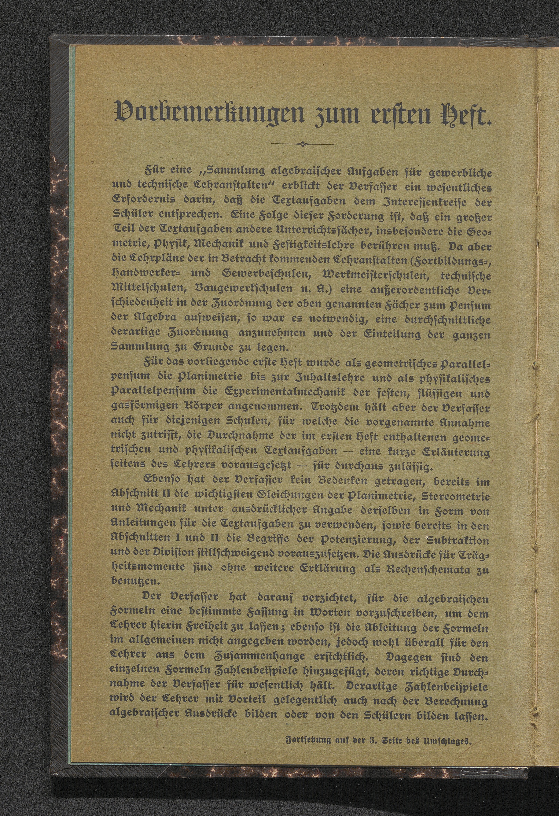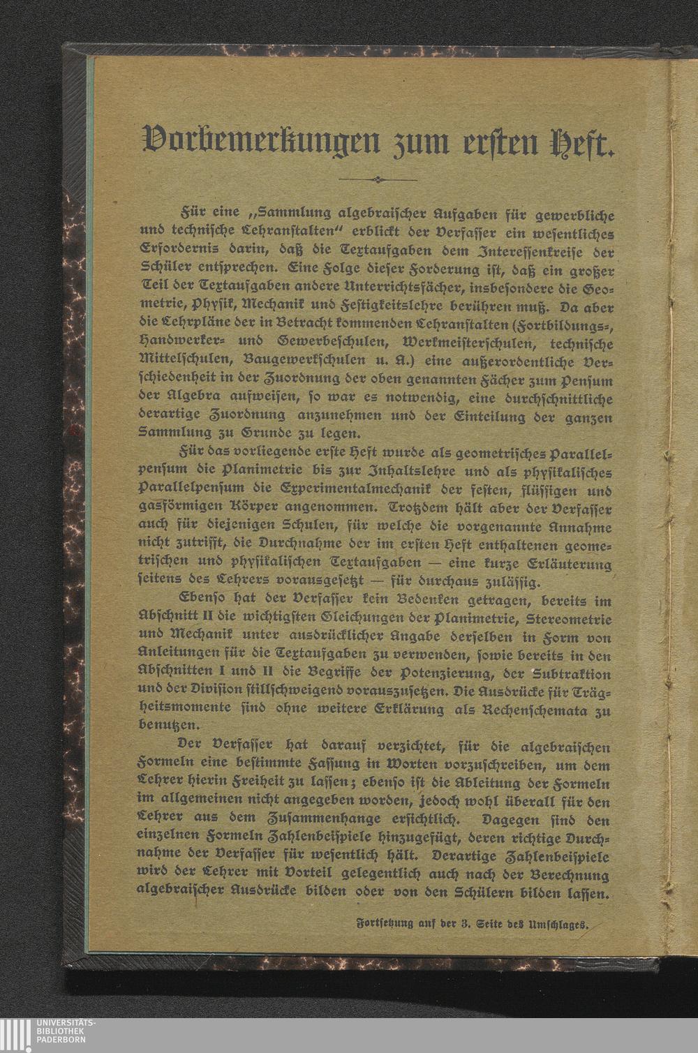 1 (1901) Einführung in die Buchstabenrechnung; die vier Grundoperationen einschließlich Potenzierung; Aufsuchen der Quadratwurzel und Kubikwurzel