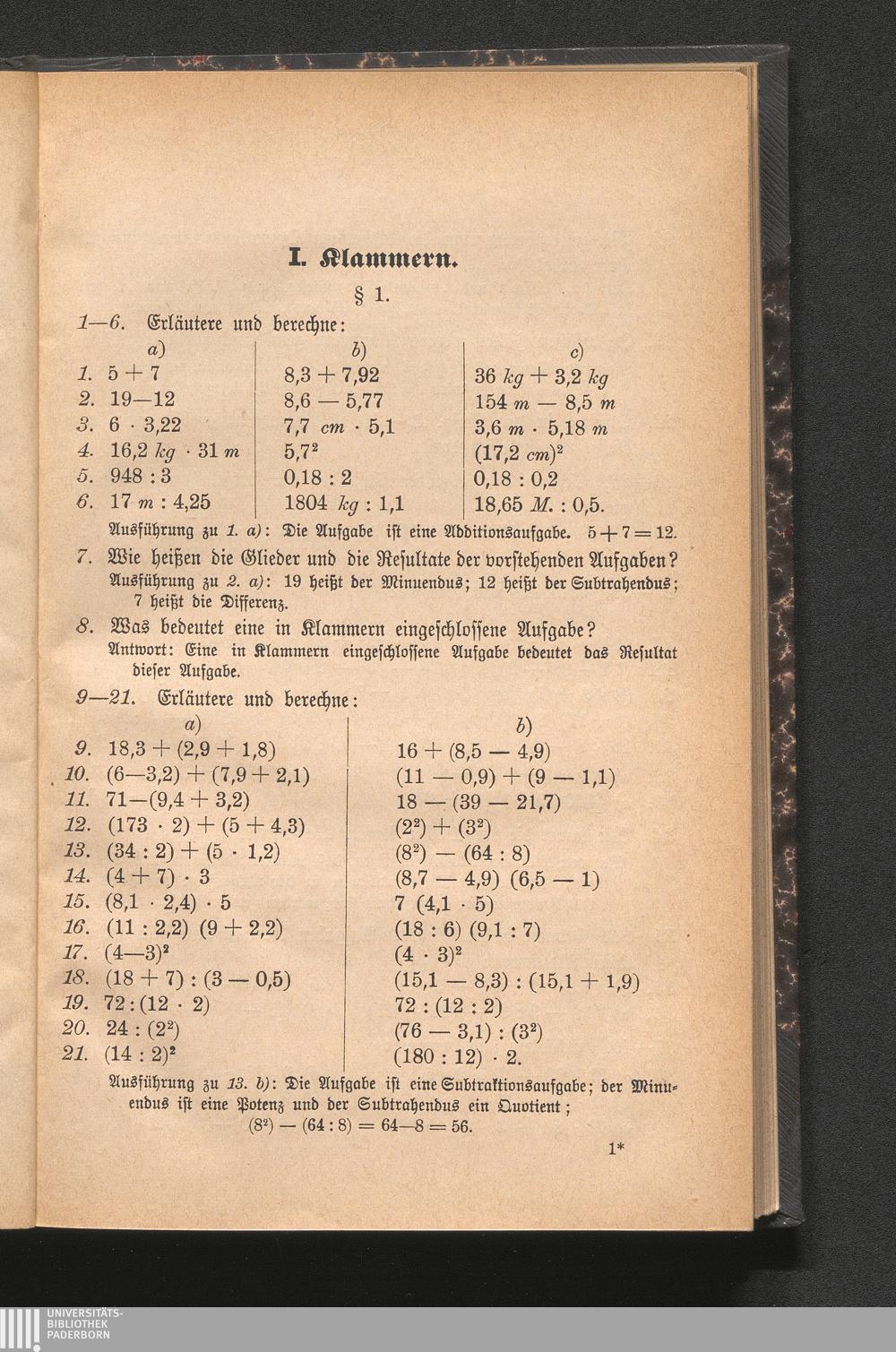 1 (1901) Einführung in die Buchstabenrechnung; die vier Grundoperationen einschließlich Potenzierung; Aufsuchen der Quadratwurzel und Kubikwurzel