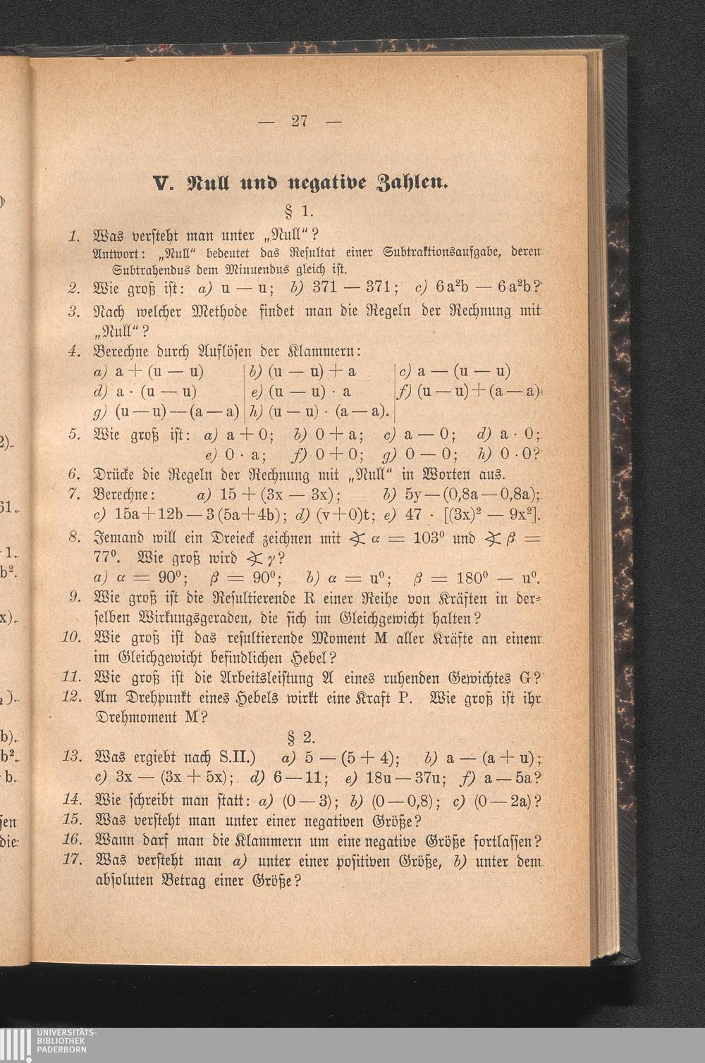 1 (1901) Einführung in die Buchstabenrechnung; die vier Grundoperationen einschließlich Potenzierung; Aufsuchen der Quadratwurzel und Kubikwurzel