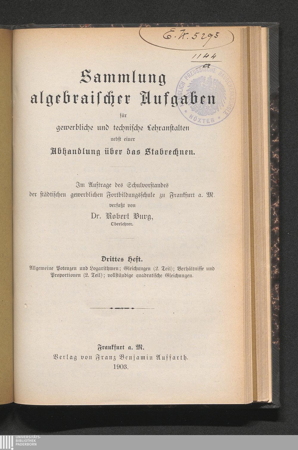 3 (1903) Allgemeine Potenzen und Logarithmen; Gleichungen (2. Teil); Verhältnisse und Proportionen (2. Teil); vollständige quadratische Gleichungen