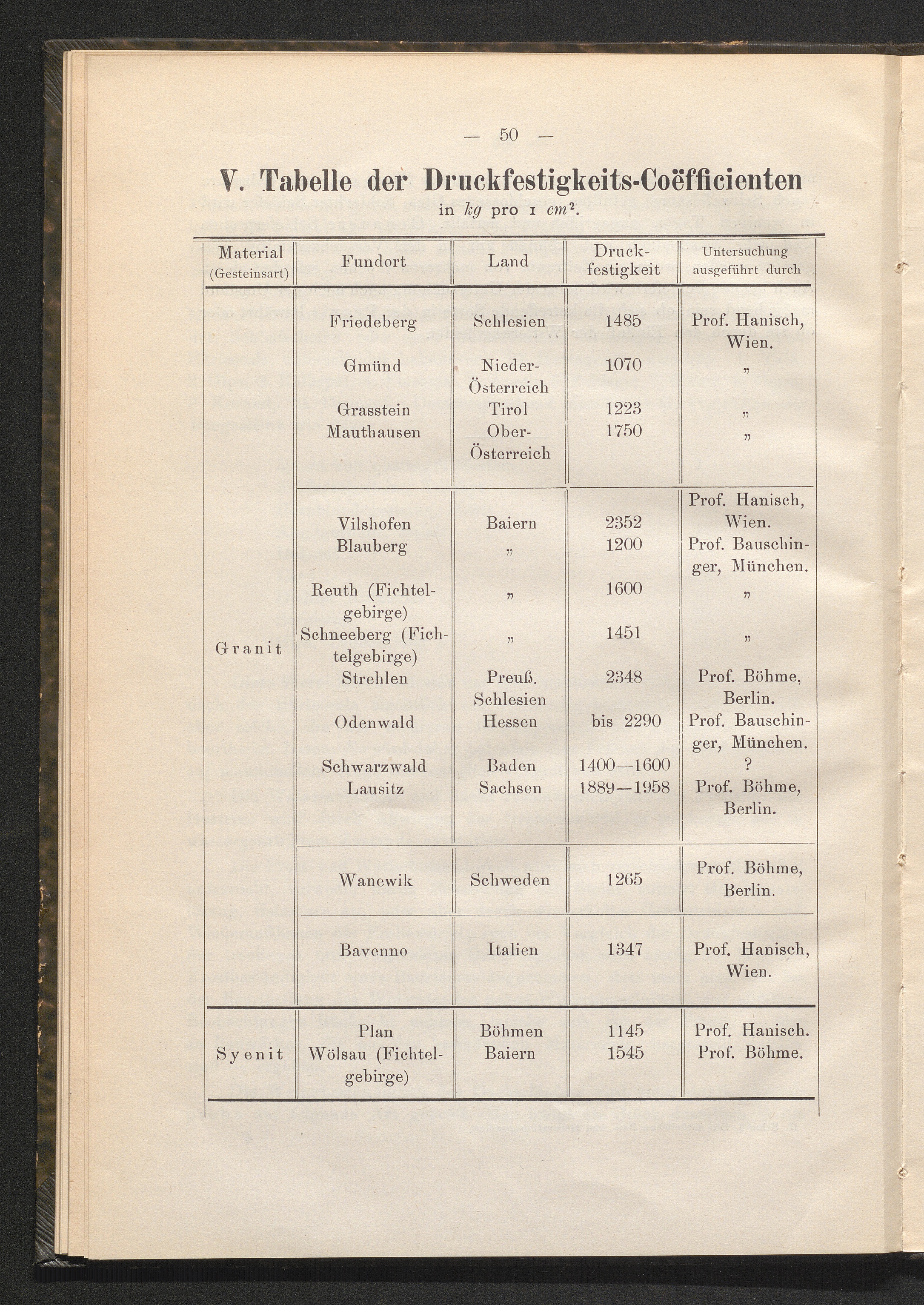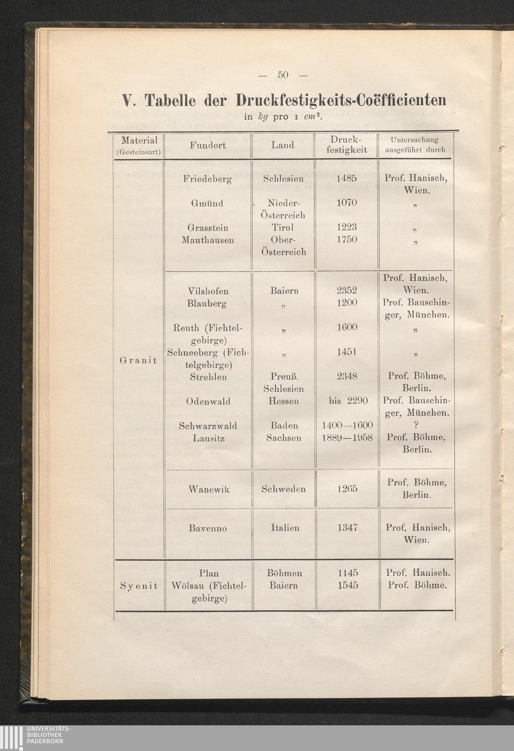 V. Tabelle der Druckfestigkeitscoëfficienten.