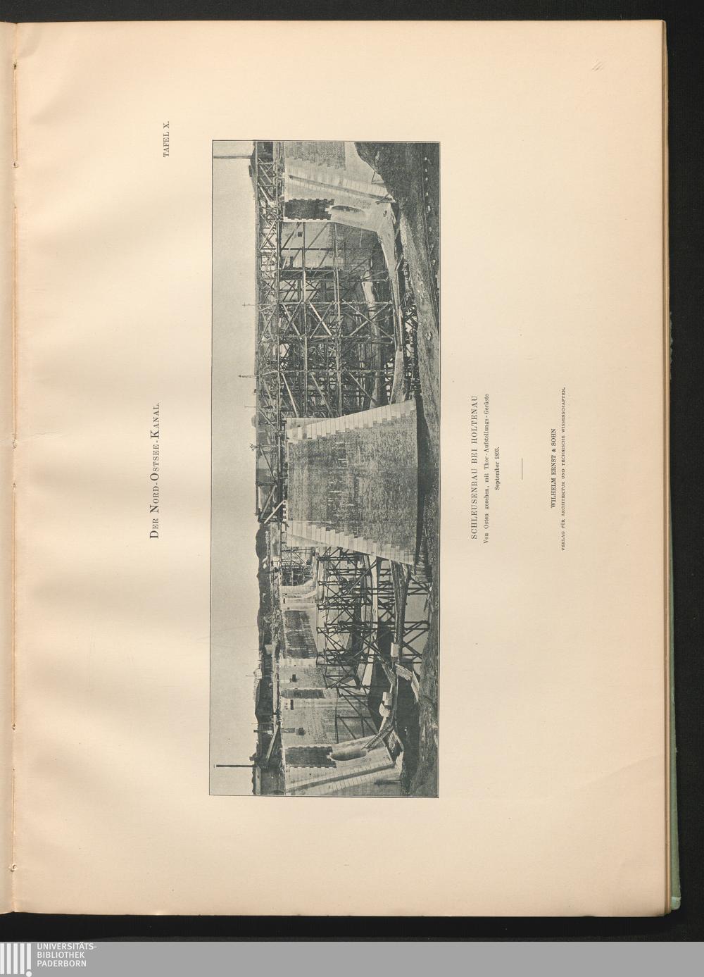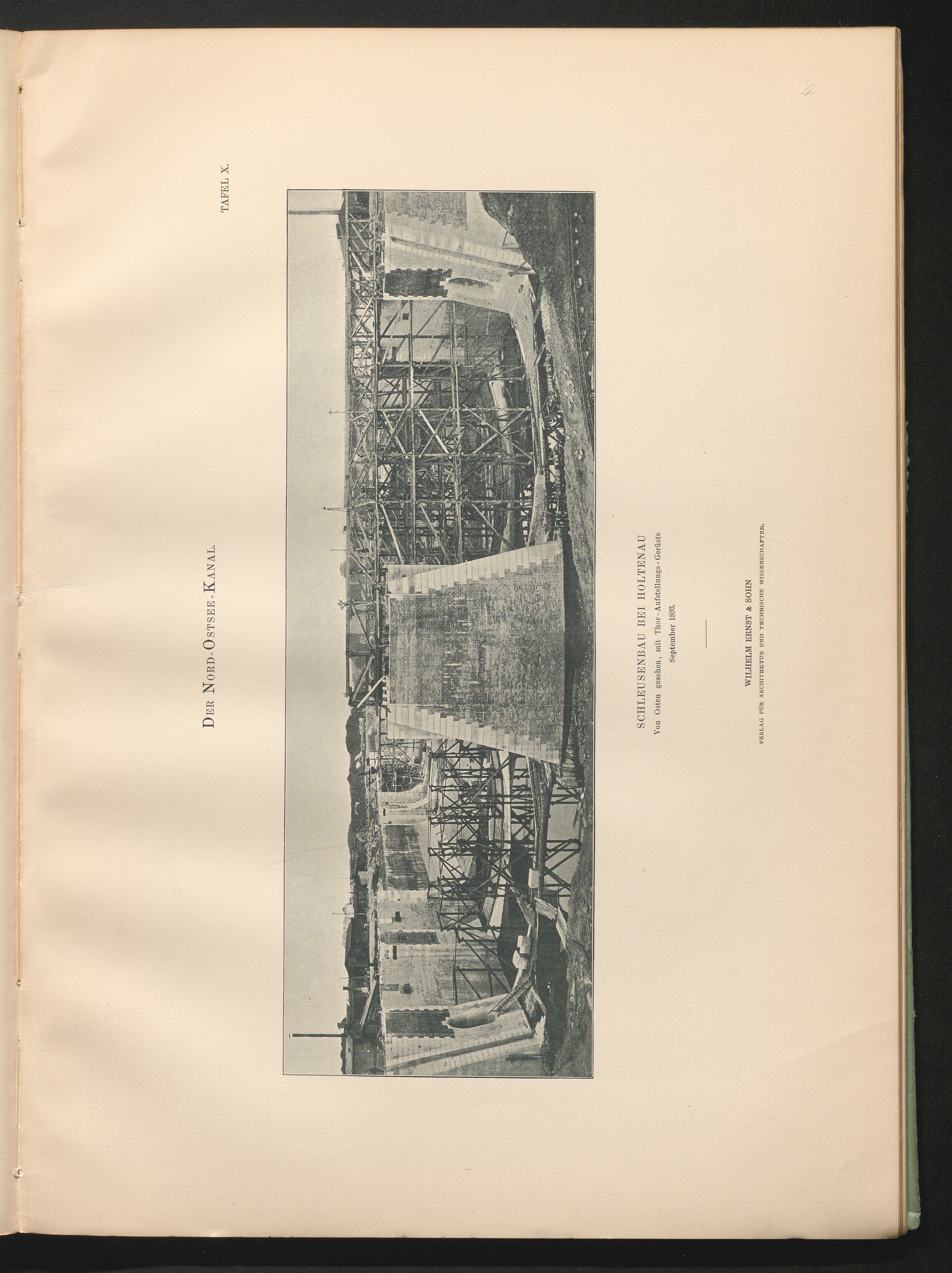 X. Schleusenbau bei Holtenau. Von Osten gesehen, mit Thor-Aufstellungs-Gerüste