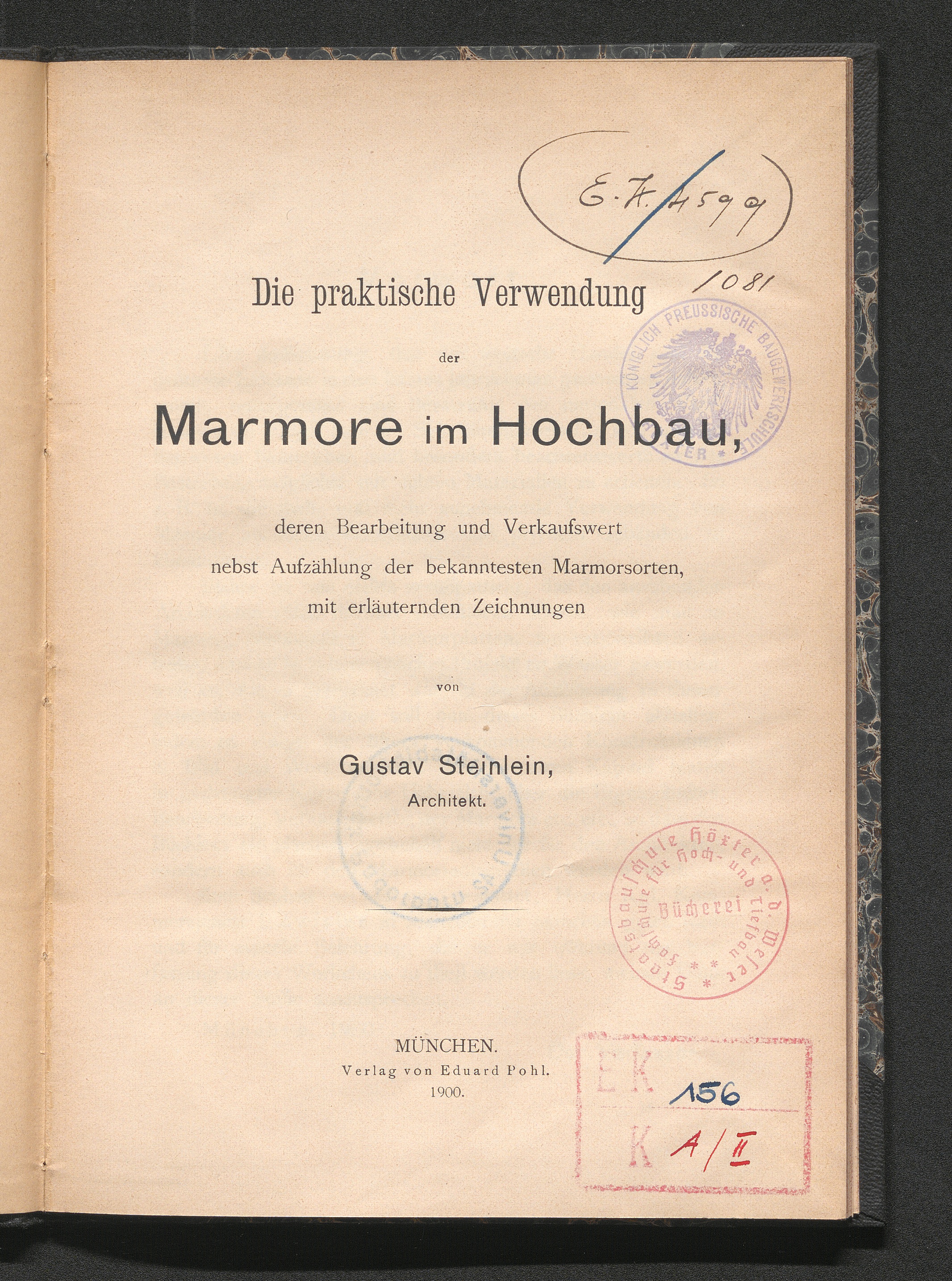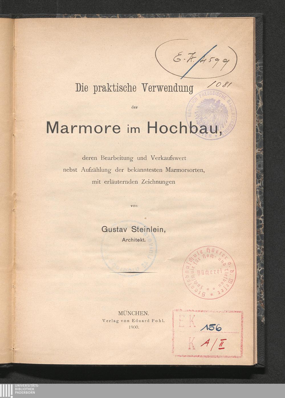 Die praktische Verwendung der Marmore im Hochbau, deren Bearbeitung und Verkaufswert nebst Aufzählung der bekanntesten Marmorsorten : mit erläuternden Zeichnungen / von Gustav Steinlein