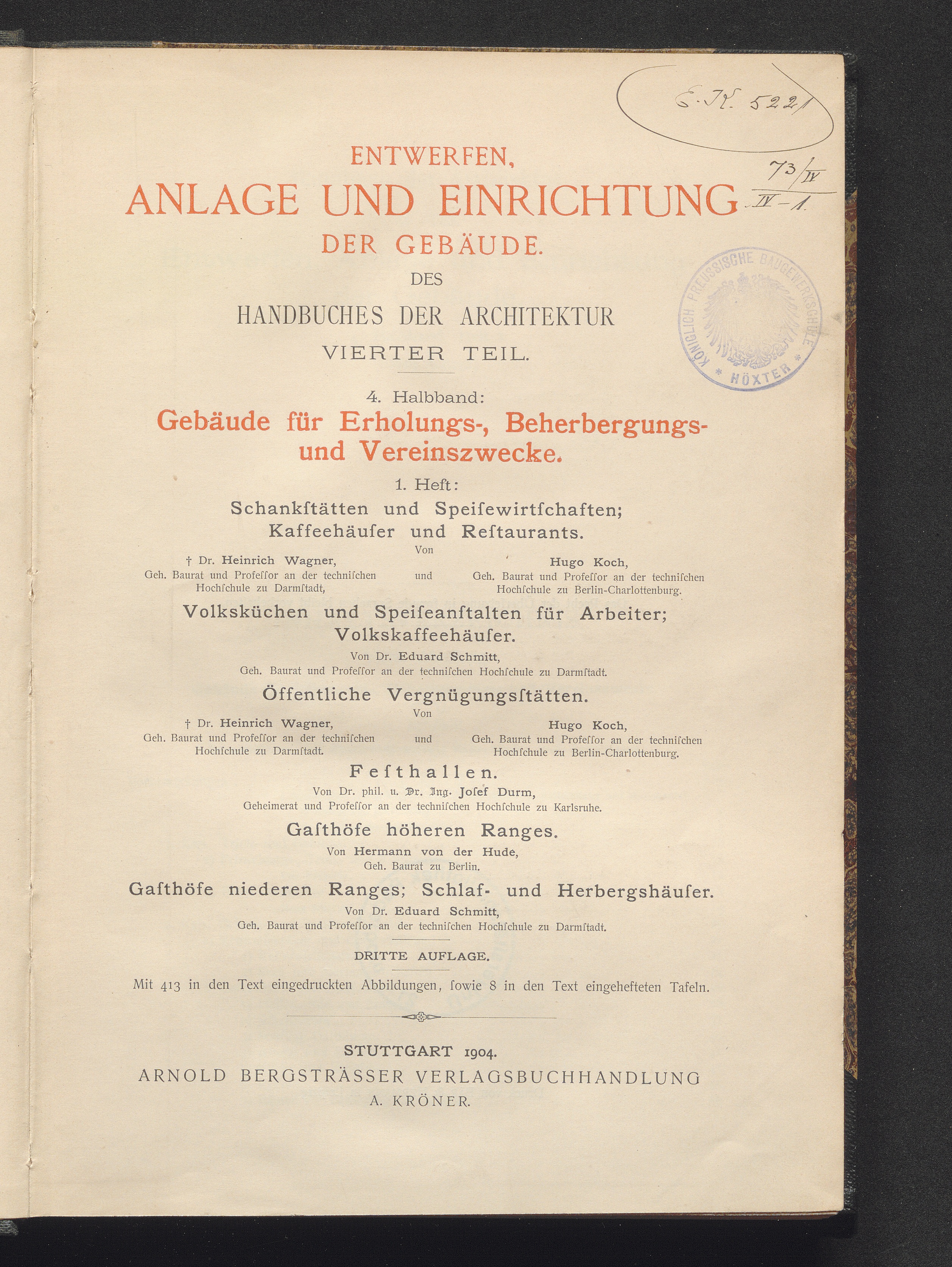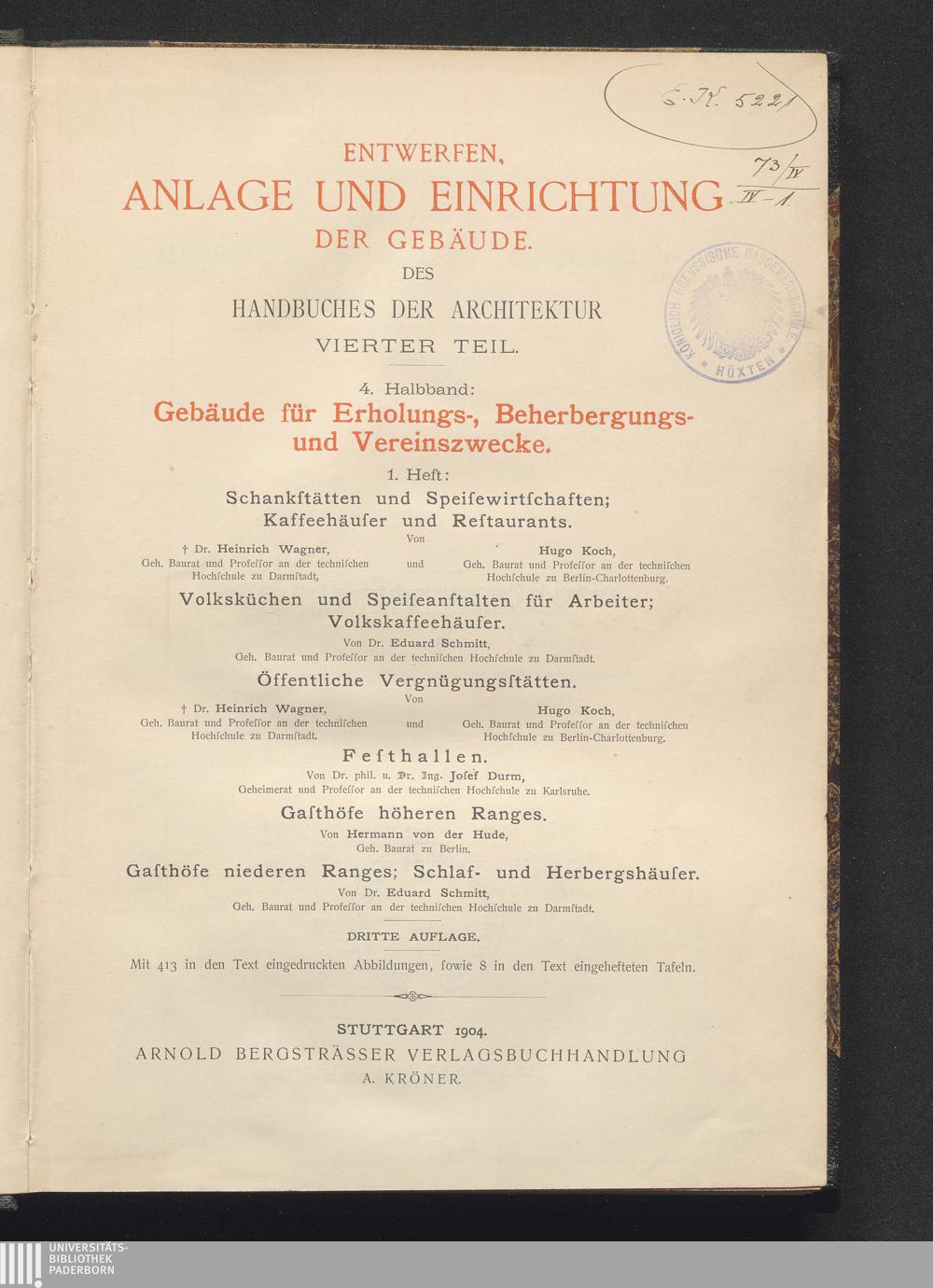 Schankstätten und Speisewirtschaften, Kaffeehäuser und Restaurants / von Heinrich Wagner und Hugo Koch