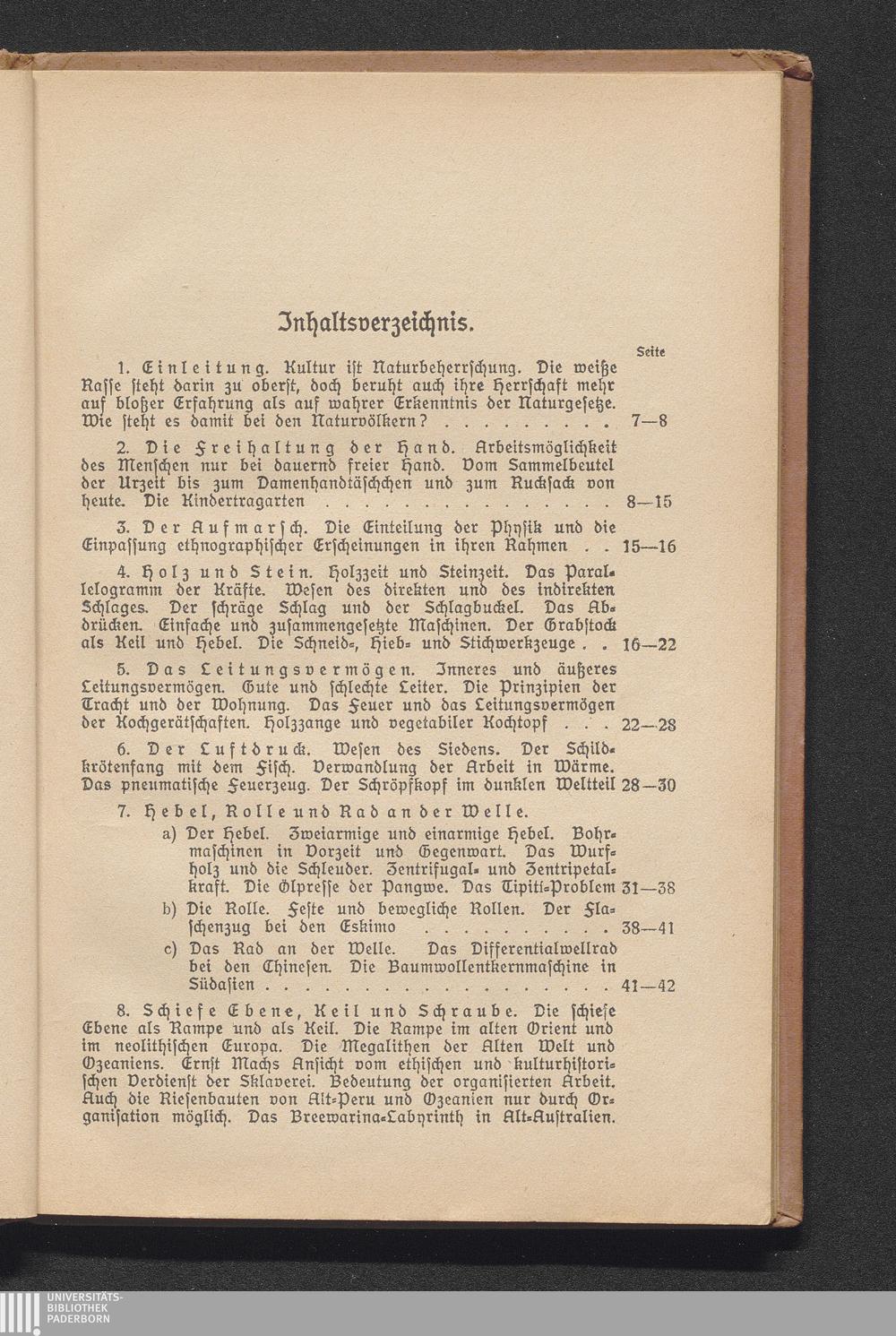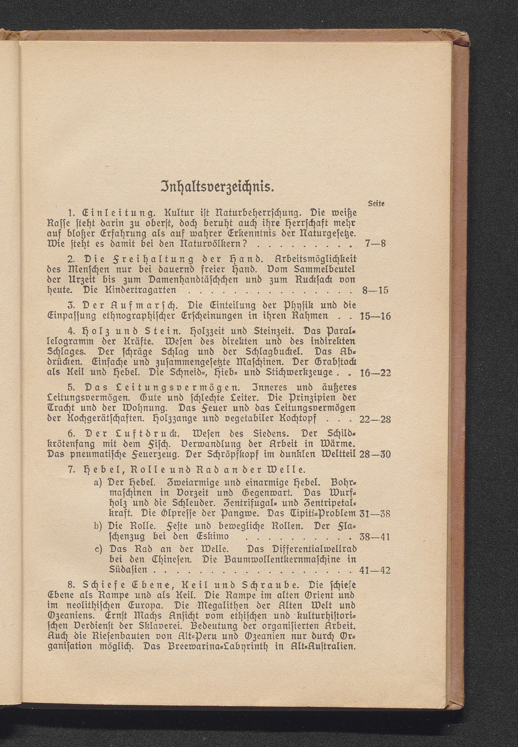 8. Schiefe Ebene, Keil und Schraube. Die schiefe Ebene als Rampe und als Keil. Die Rampe im alten Orient und im neolithischen Europa. Die Megalithen der Alten Welt und Ozeaniens. Ernst Machs Ansicht vom ethischen und kulturhistorischen Verdienst der Sklaverei. Bedeutung der organisierten Arbeit. Auch die Riesenbauten von Alt-Peru und Ozeanien nur durch Organisation möglich. Das Breewarina-Labyrinth in Alt-Australien. Seilbahnen und Gleitbrücken in den Kordilleren und in Hochasien [...]