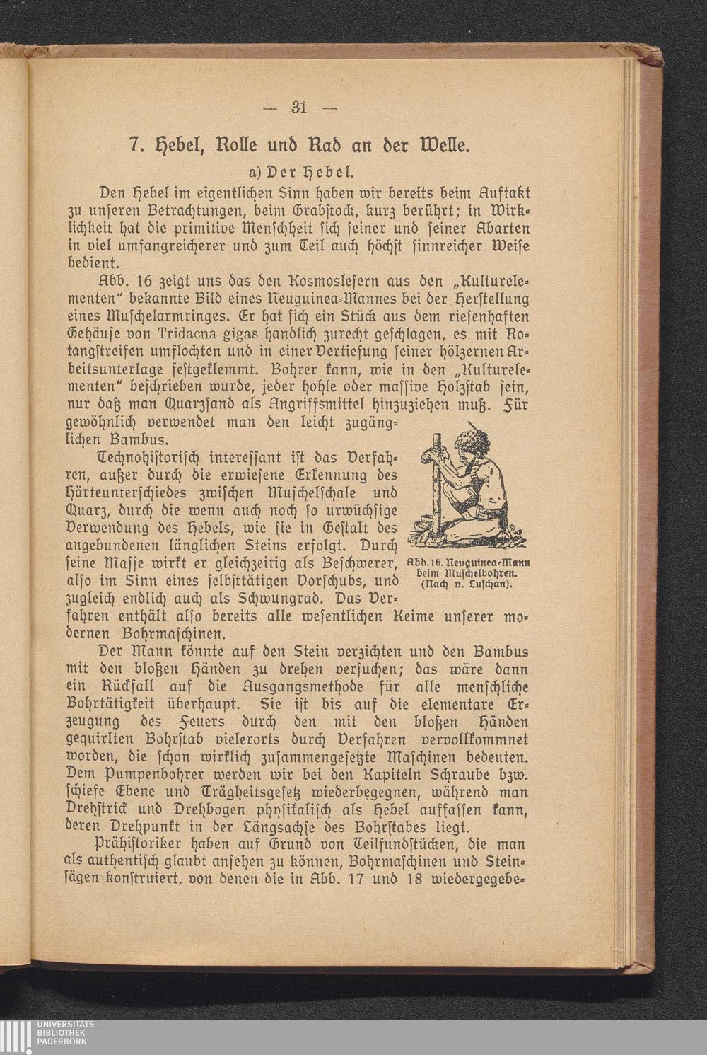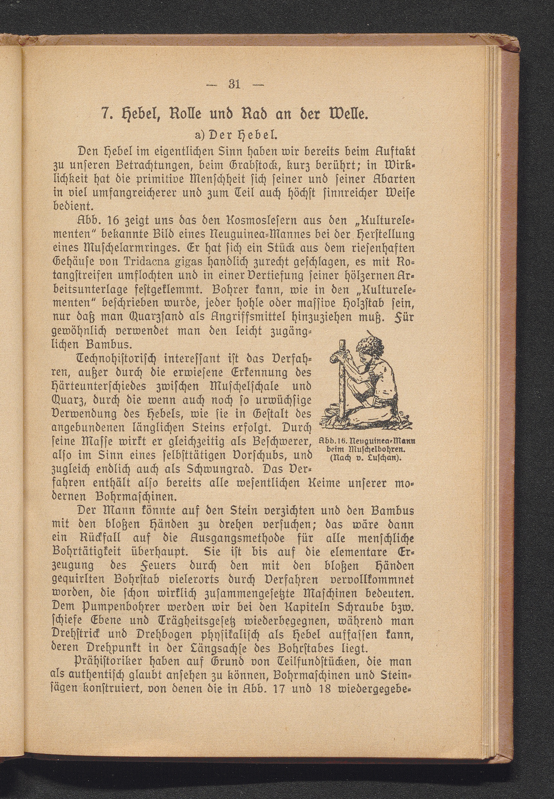 a) Der Hebel. Zweiarmige und einarmige Hebel. Bohrmaschinen in Vorzeit und Gegenwart.[...]