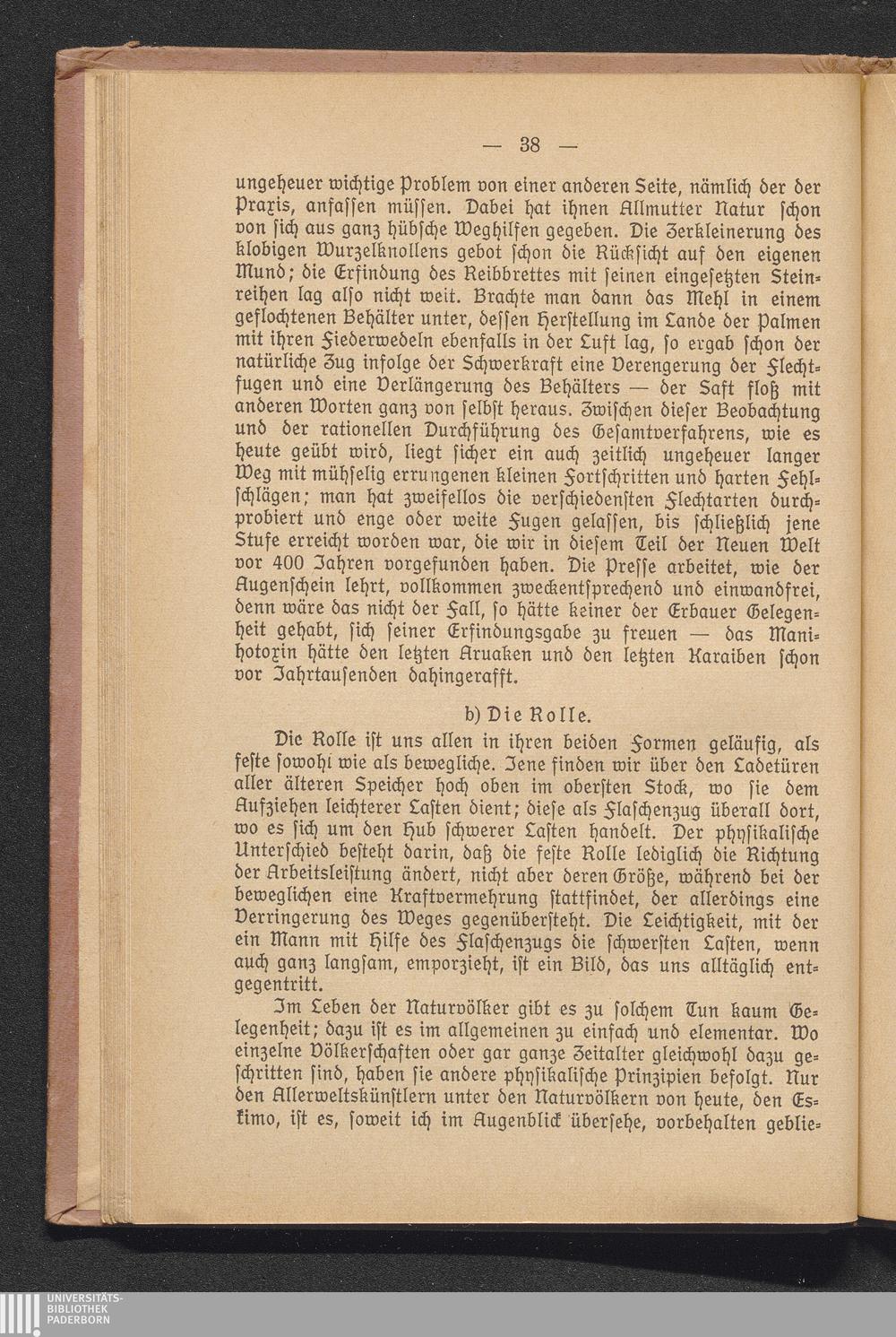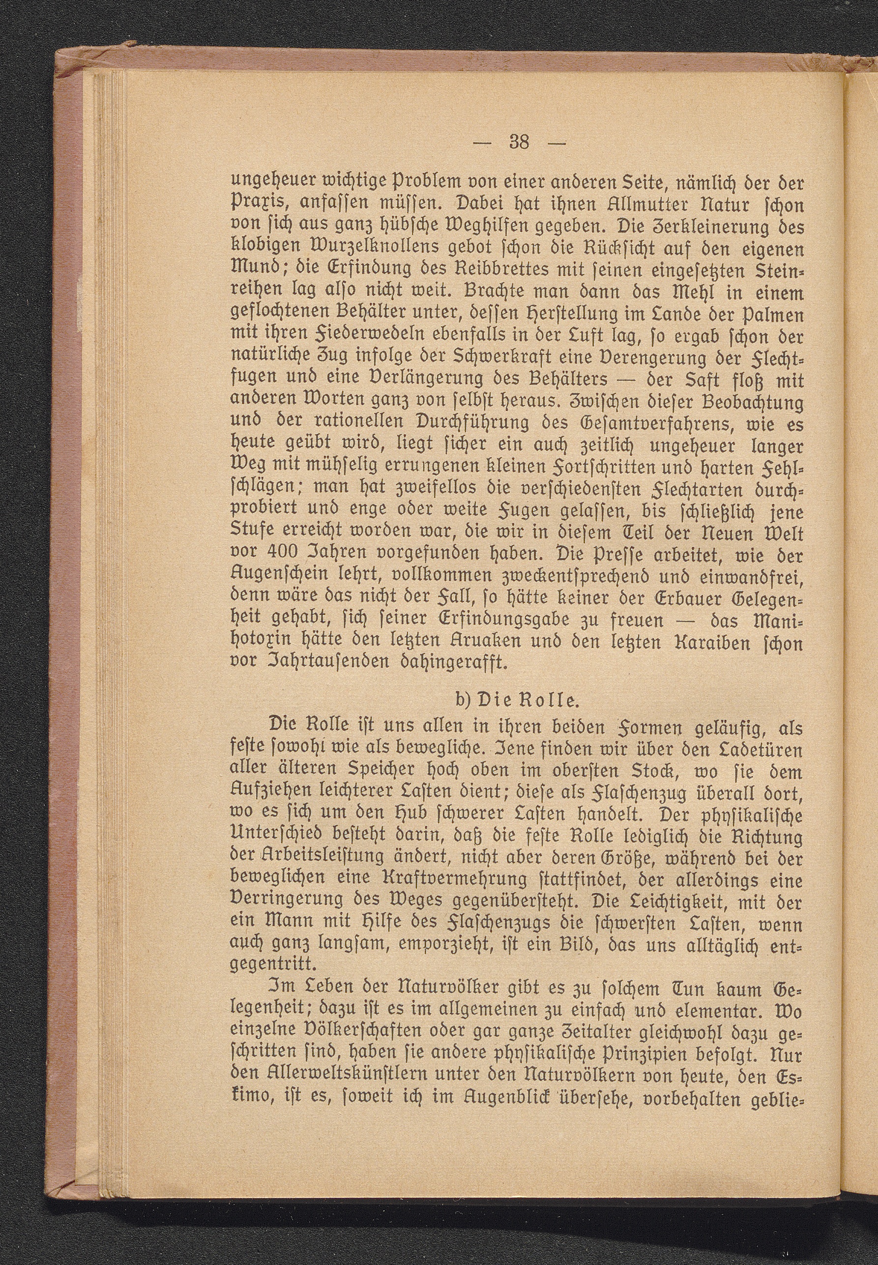 a) Der Hebel. Zweiarmige und einarmige Hebel. Bohrmaschinen in Vorzeit und Gegenwart. Das Wurfholz und die Schleuder. Zentrifugal- und Zentripetalkraft. Die Ölpresse der Pangwe. Das Tipiti-Problem.