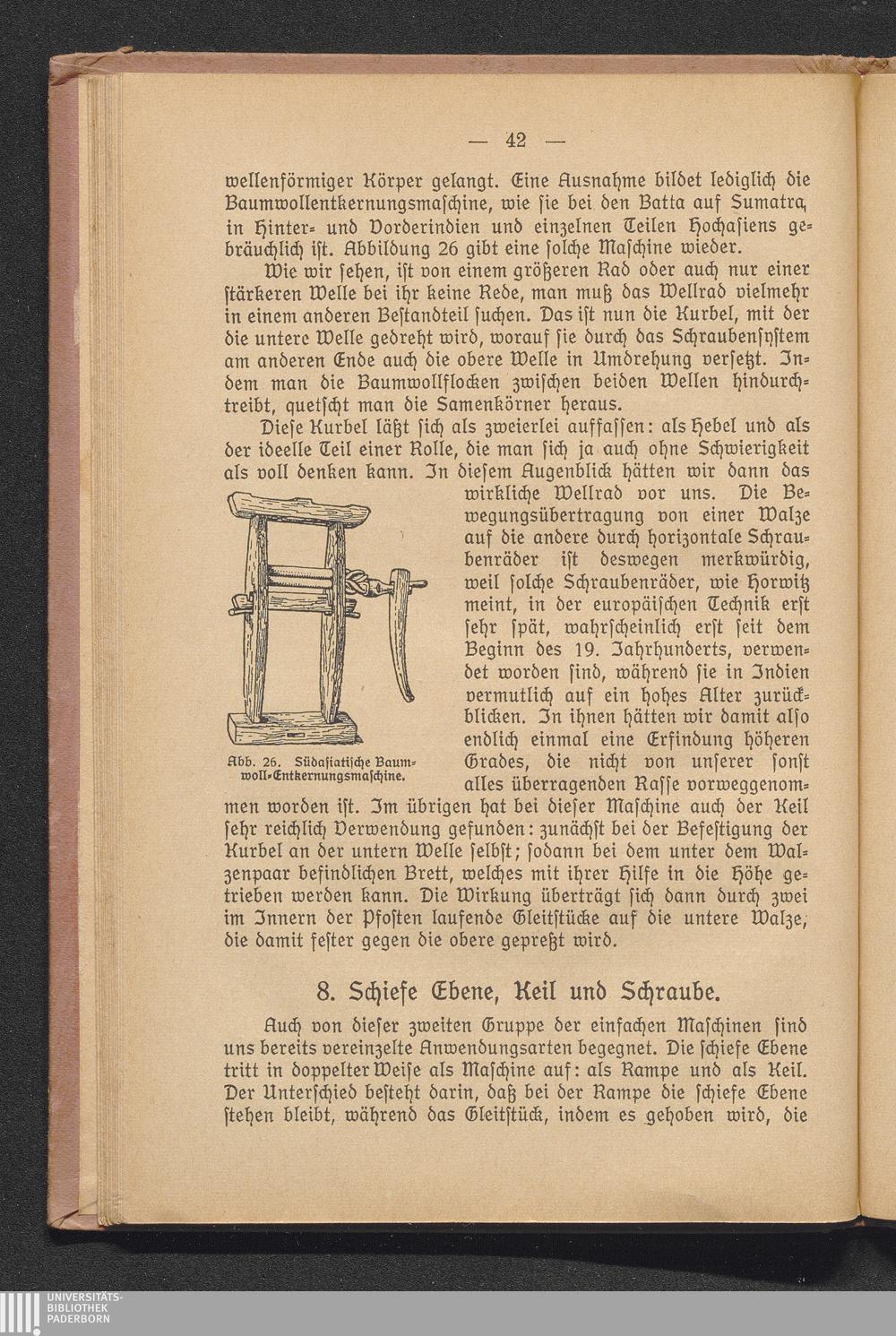 c) Das Rad an der Welle. Das Differentialwellrad bei den Chinesen. Die Baumwollentkernmaschine in Südasien.