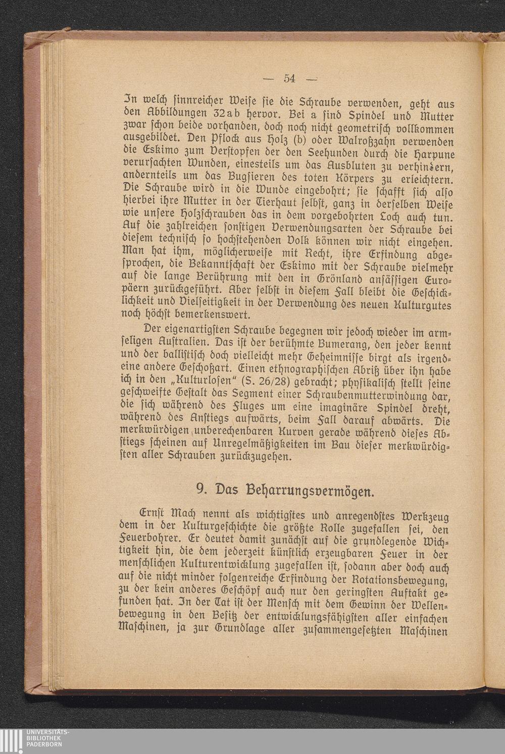 a) Der Hebel. Zweiarmige und einarmige Hebel. Bohrmaschinen in Vorzeit und Gegenwart. Das Wurfholz und die Schleuder. Zentrifugal- und Zentripetalkraft. Die Ölpresse der Pangwe. Das Tipiti-Problem.