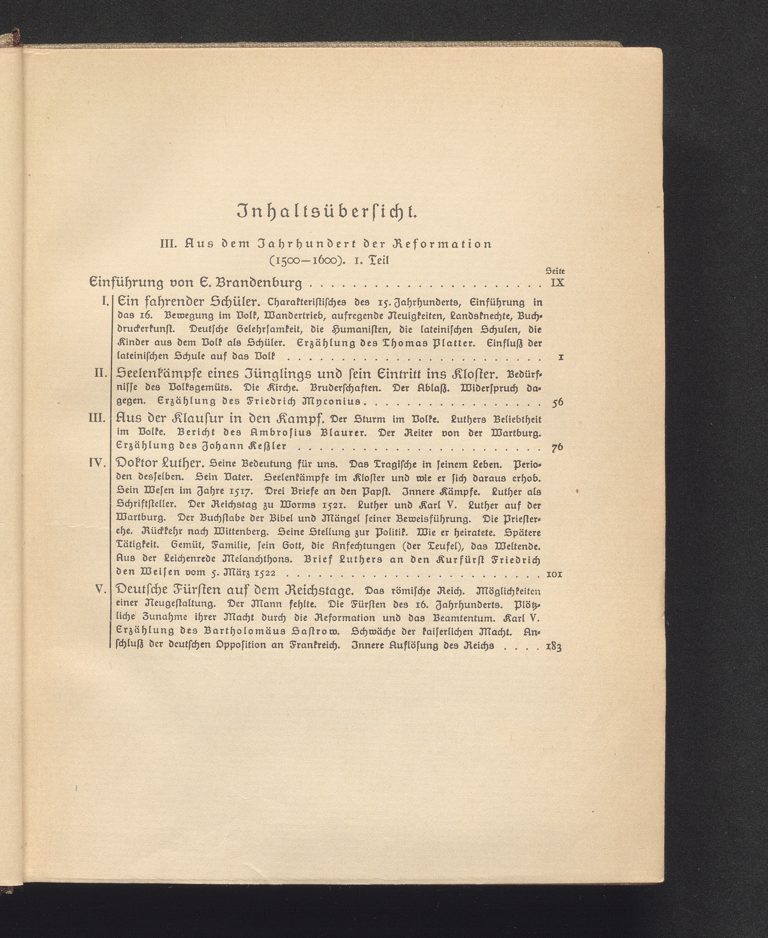 I. Ein fahrender Schüler. Charakteristisches des 15. Jahrhunderts, Einführung in das 16. Bewegung im Volk, Wandertrieb, aufregende Neuigkeiten, Landsknechte, Buchdruckerkunst. Deutsche Gelehrsamkeit, die Humanisten, die lateinischen Schulen, die Kinder aus dem Volk als Schüler. Erzählungen des Thomas Platter. Einflusz der lateinischen Schule auf das Volk.