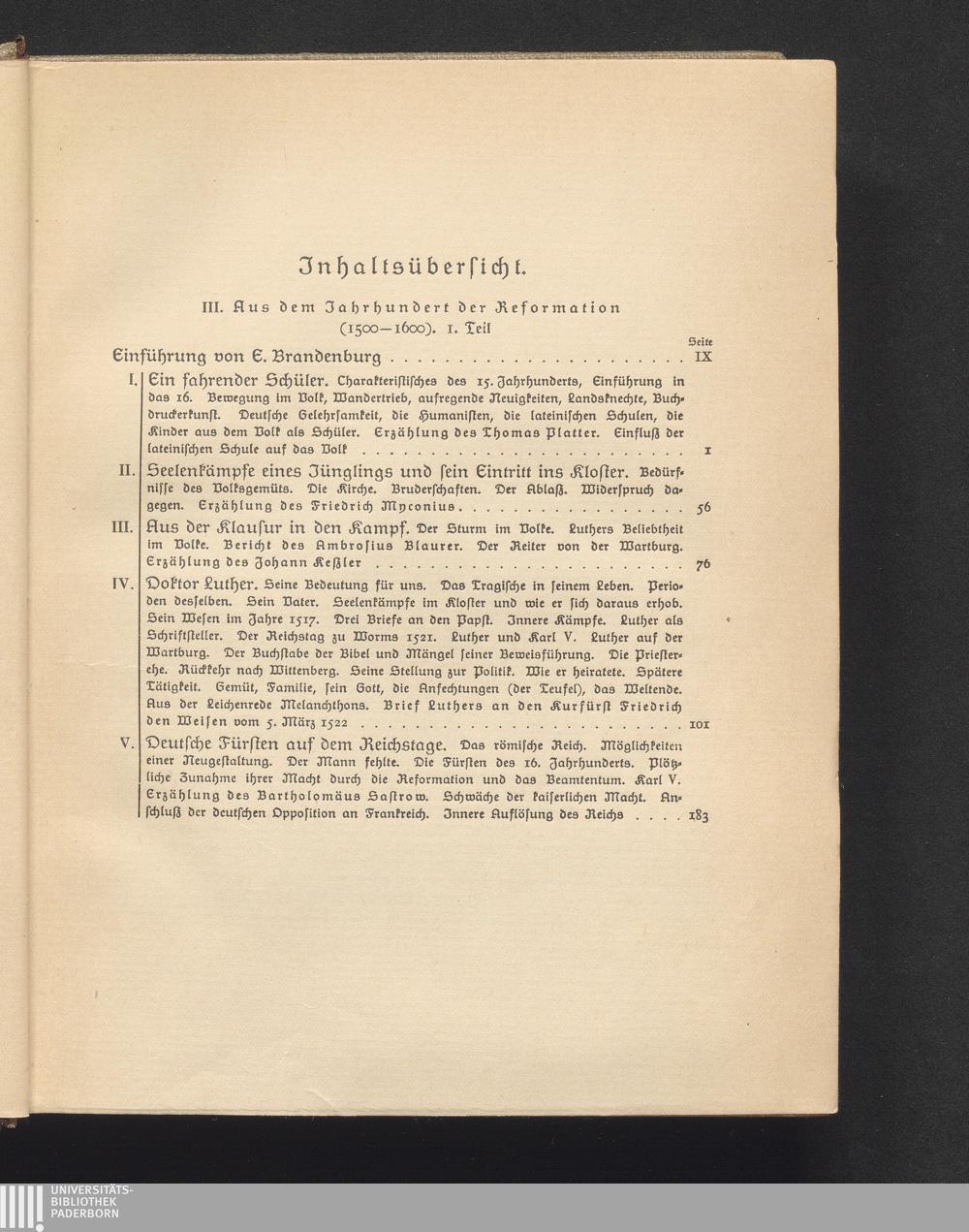 Jnhaltsübersicht. III. Aus dem Jahrhundert der Reformation (1500 - 1600). 1. Tei[...]