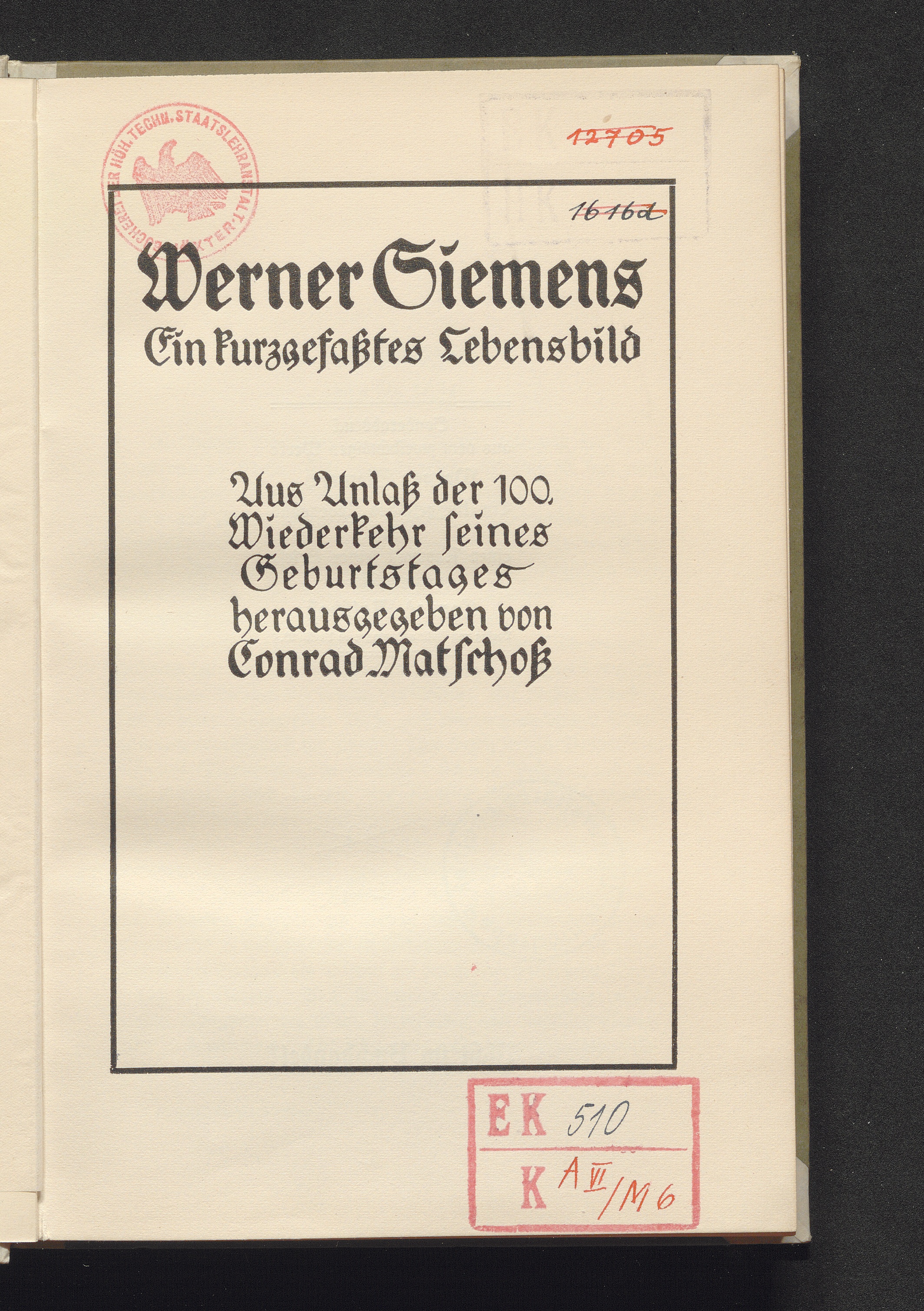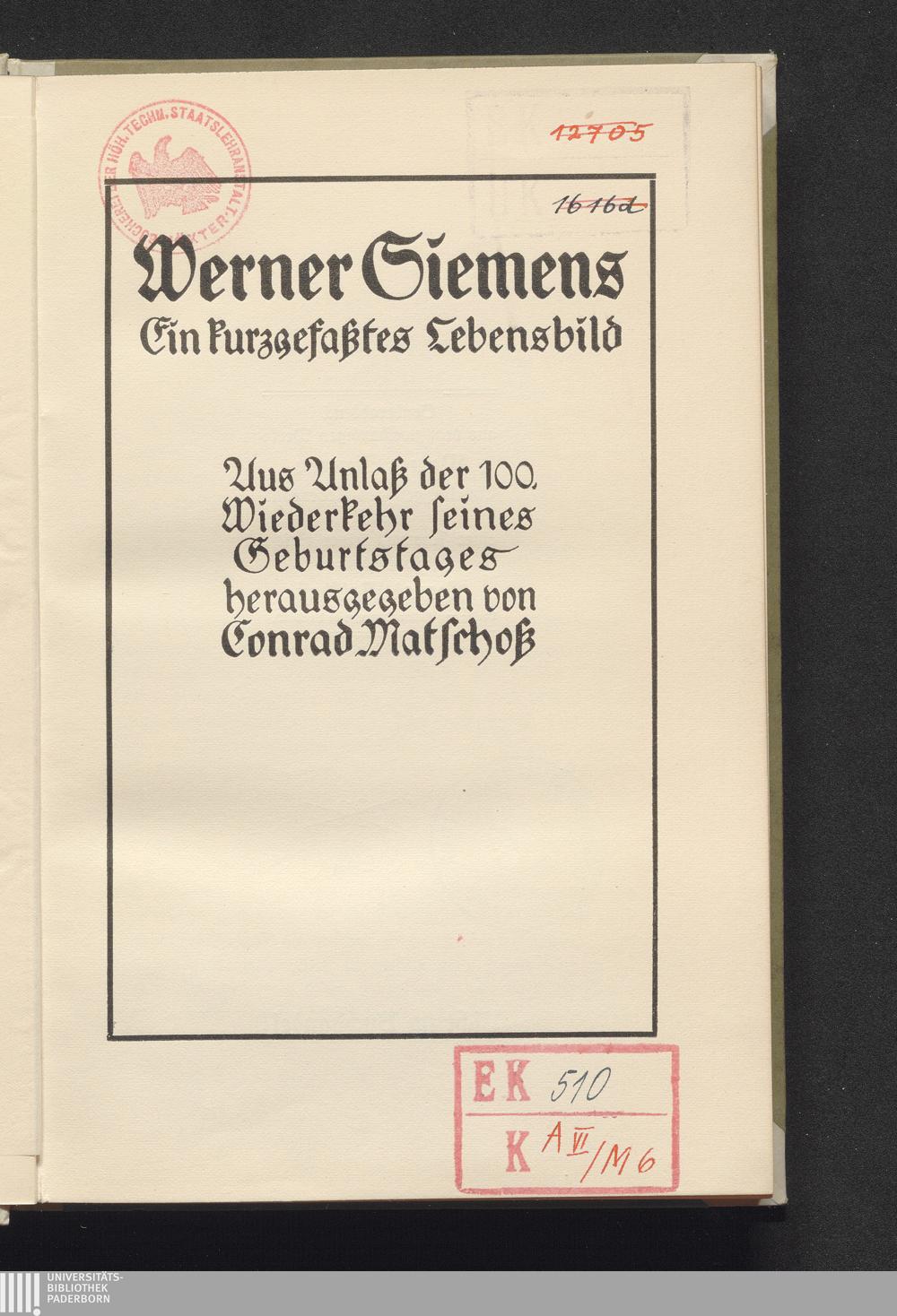 Werner Siemens : ein kurzgefasstes Lebensbild aus Anlass der 100. Wiederkehr seines Geburtstages / hrsg. von Conrad Matschoß