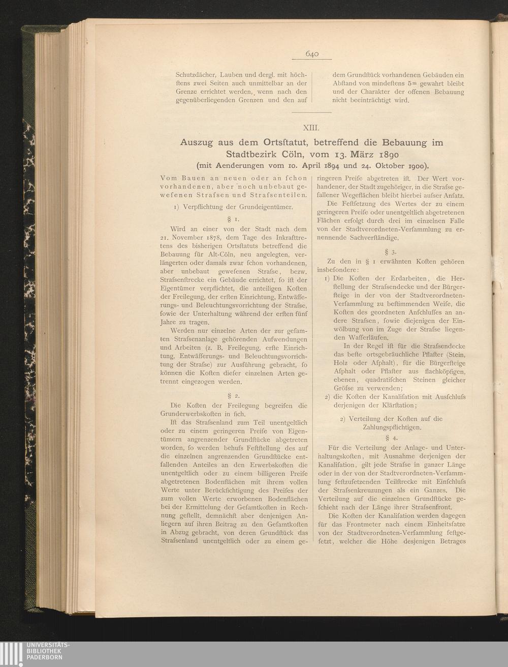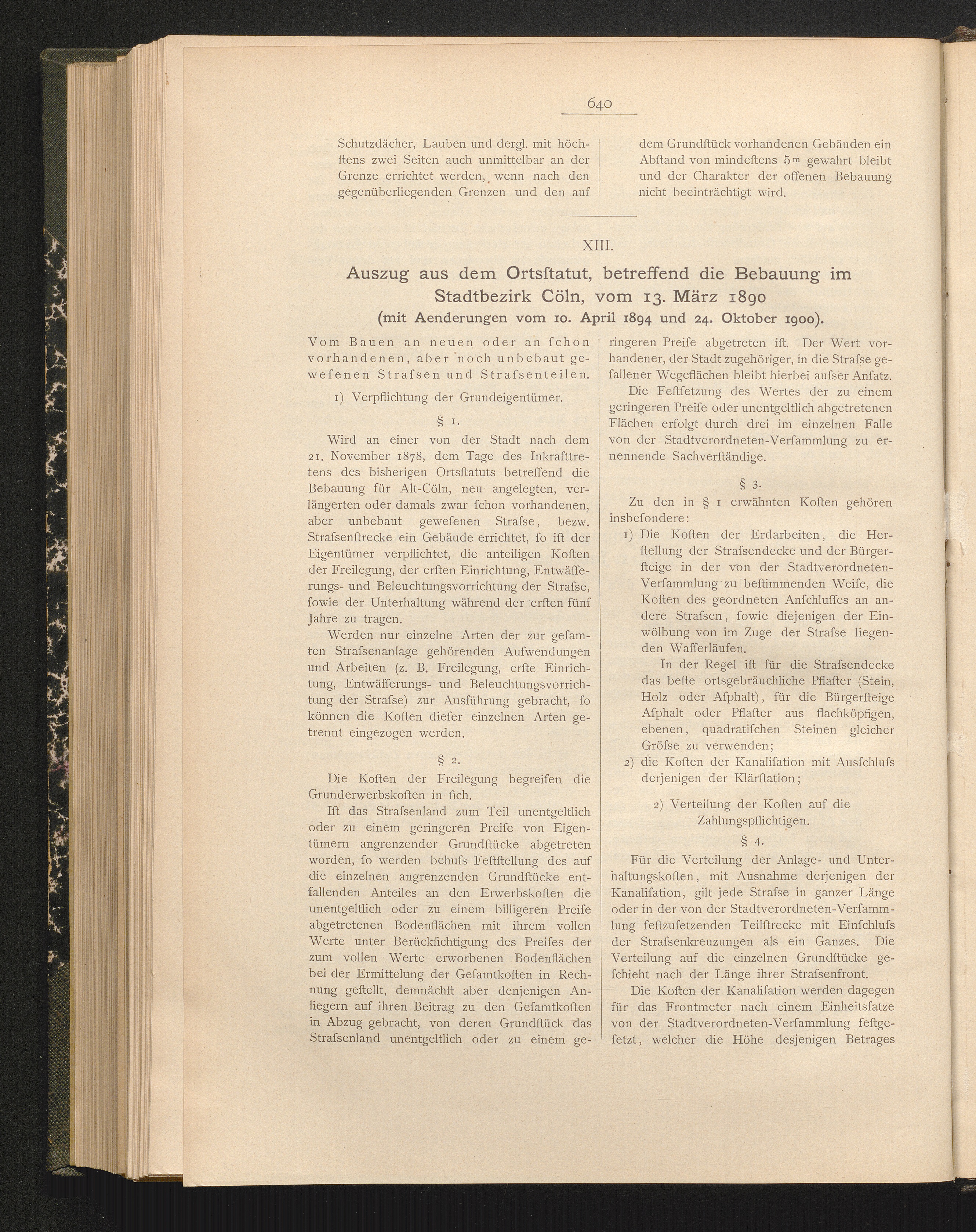 XIII. Auszug aus dem Ortsstatut, betreffend die Bebauung im Stadtbezirk Cöln, vom[...]