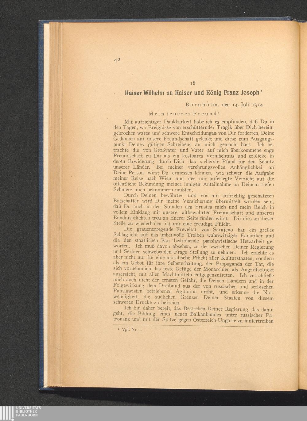 18. Bornholm, den 14. Juli 1914. Kaiser Wilhelm an Kaiser und König Franz Josep[...]