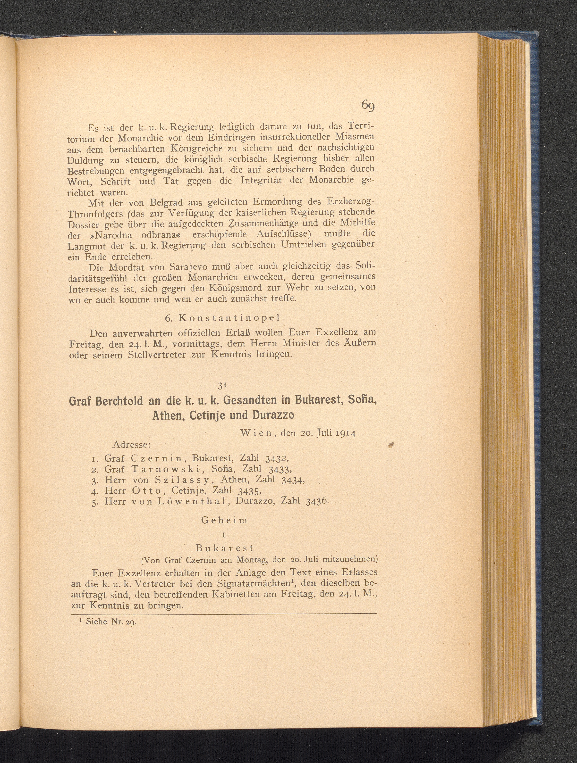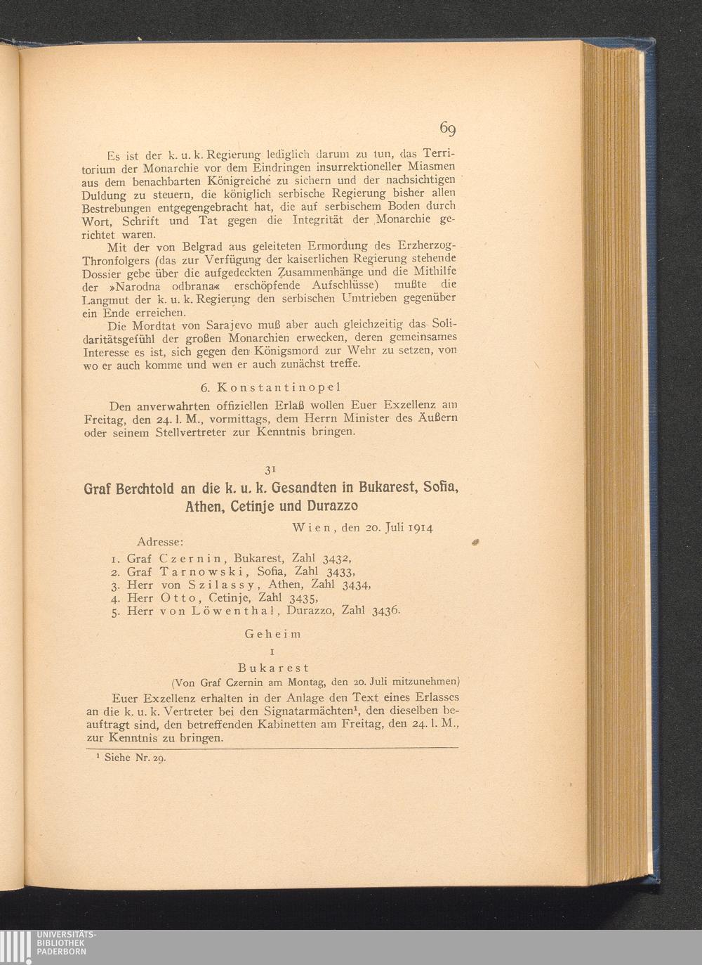 31. Wien, den 20. Juli 1914. Graf Berchtold an die k. u. k. Gesandten in Bukarest,[...]
