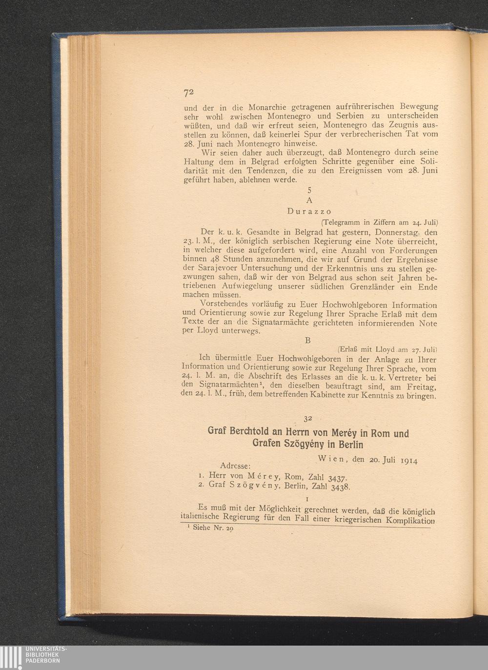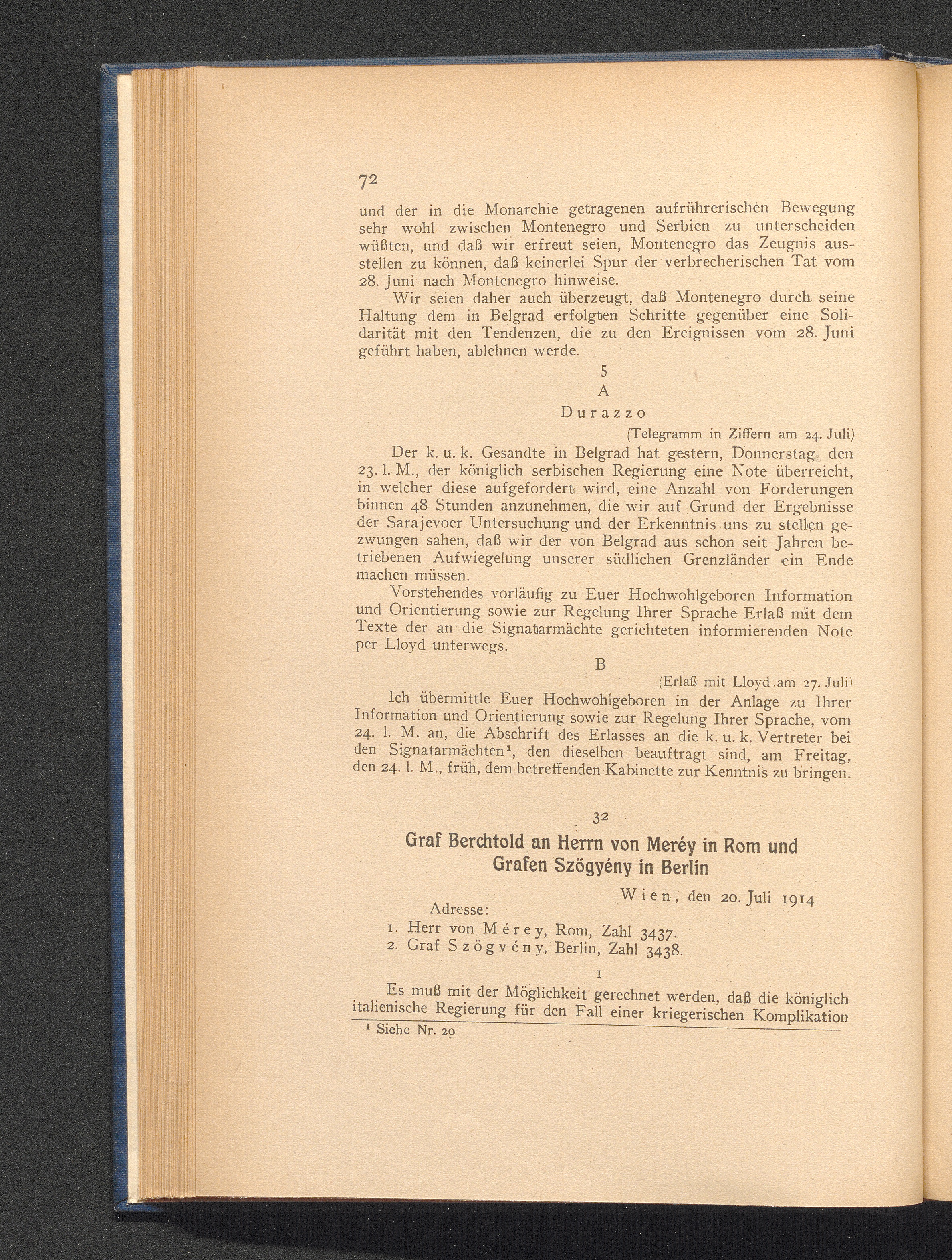 32. Wien, den 20. Juli 1914. Graf Berchtold an Herrn von Mérey in Rom und Grafen[...]