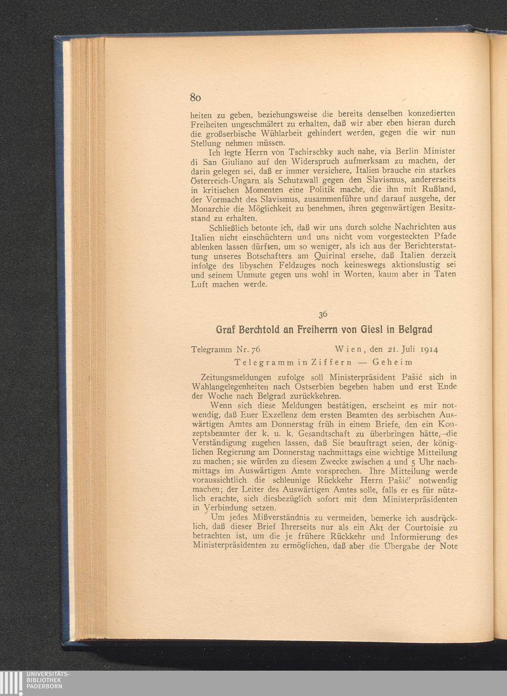 36. Wien, den 21. Juli 1914. Graf Berchtold an Freiherr von Giesl in Belgrad.