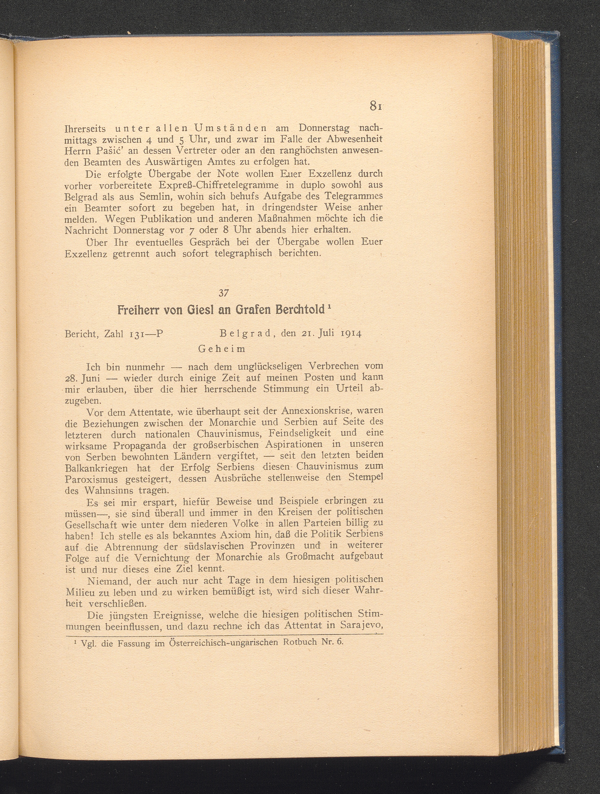 37. Belgrad, den 21. Juli 1914. Freiherr von Giesl an Grafen Berchtold.