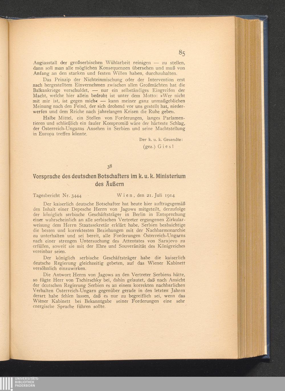 38. Wien, den 21. Juli 1914. Vorsprache des deutschen Botschafters im k. u. k. Ministerium[...]