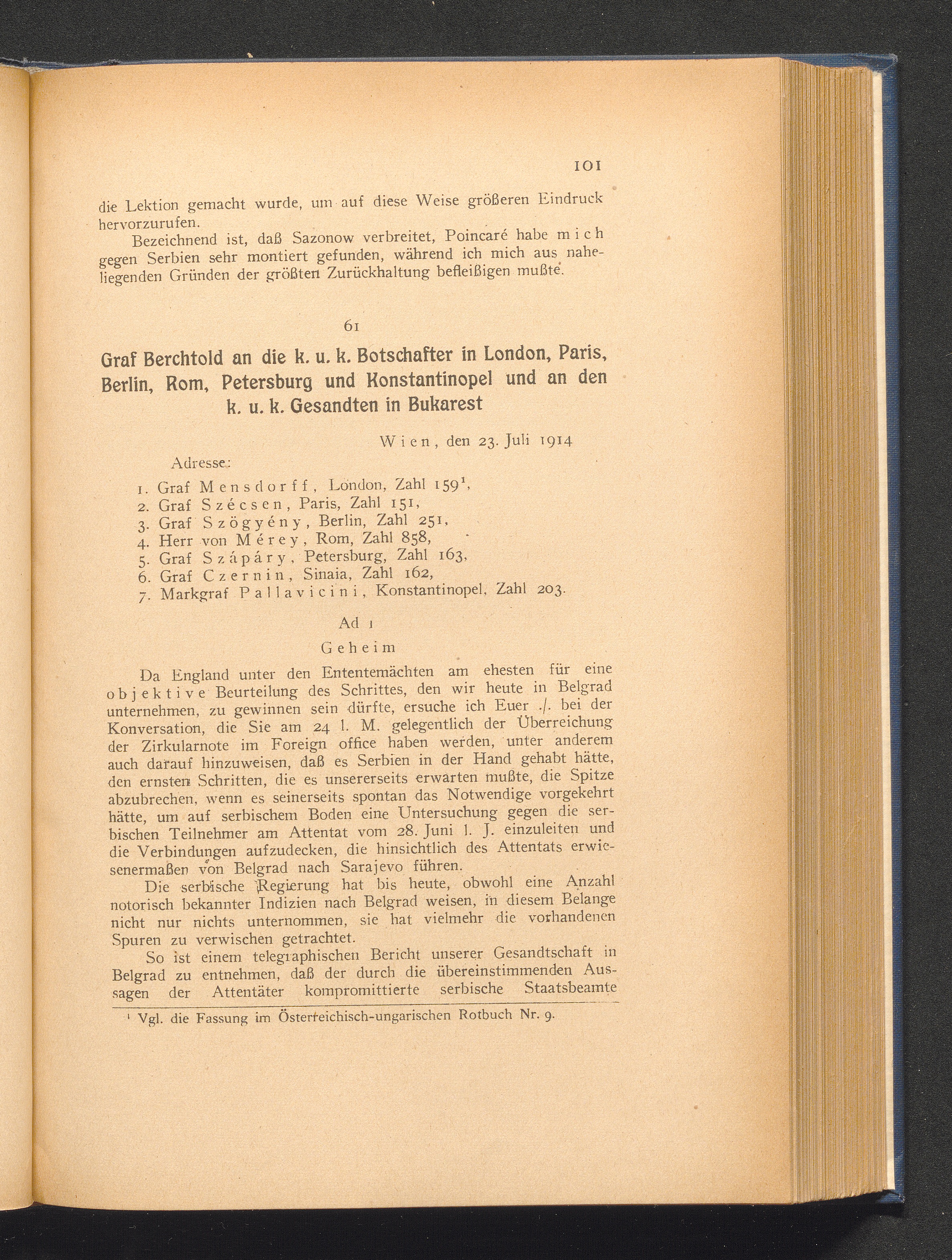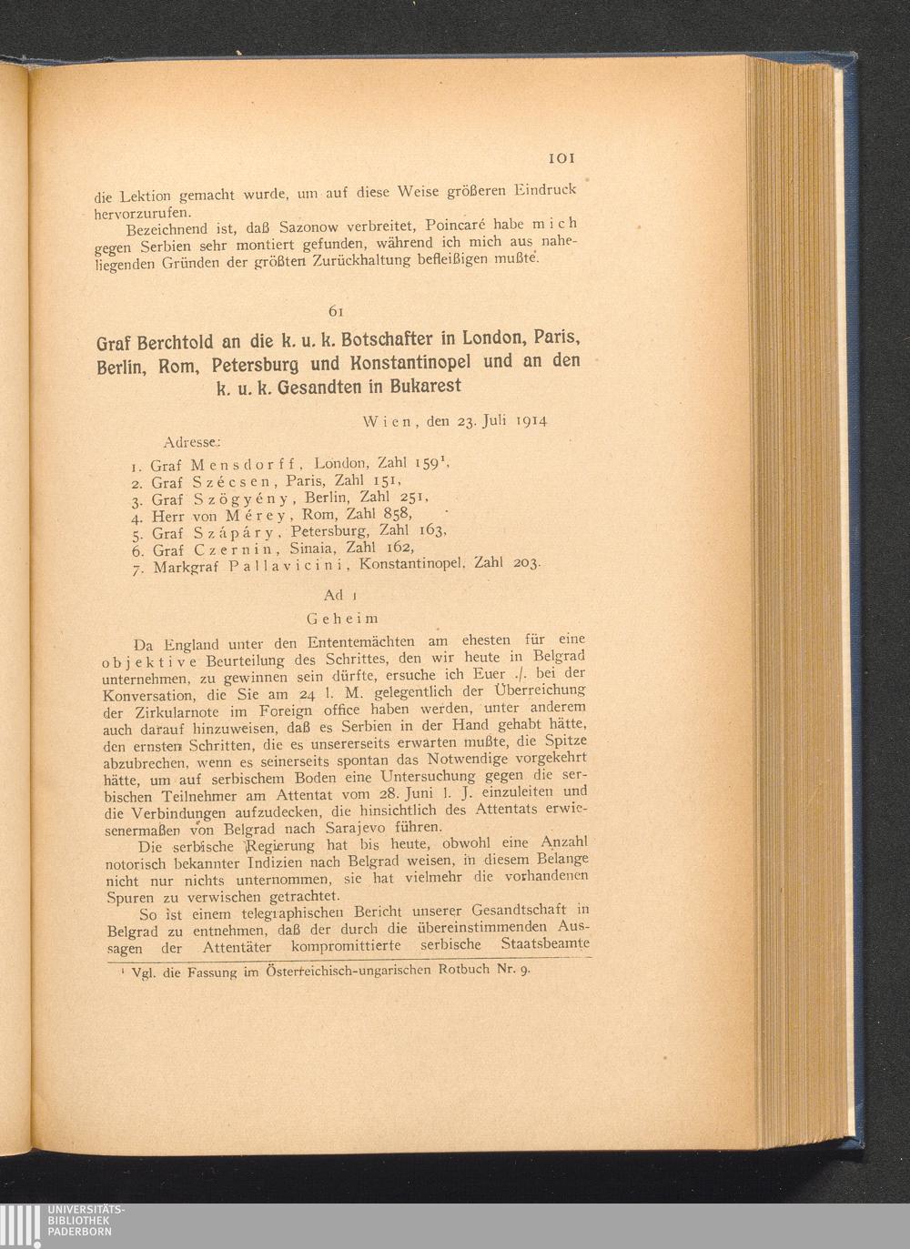 61. Wien, den 23. Juli 1914. Graf Berchtold an die k. u. k. Botschafter in London,[...]