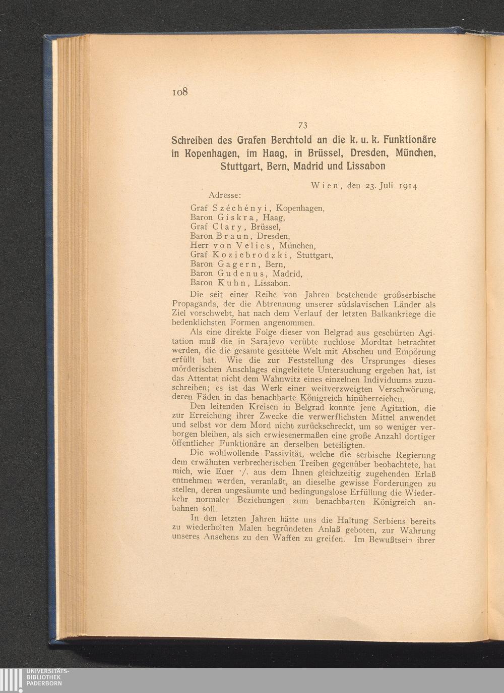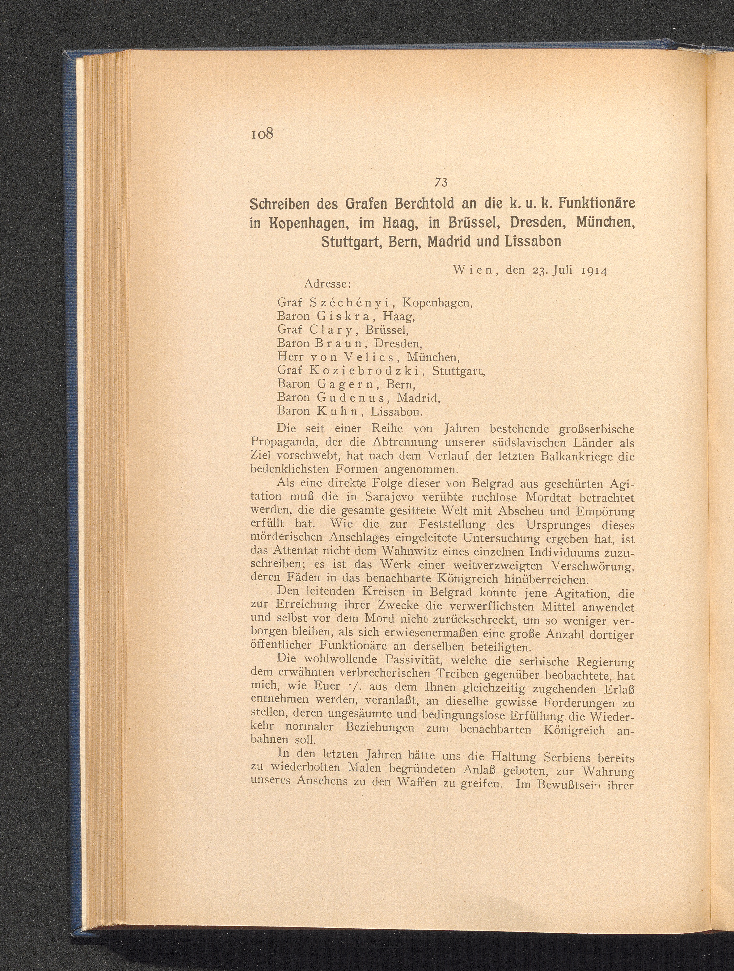 73. Wien, den 23. Juli 1914. Schreiben des Grafen Berchtold an die k. u. k. Funktionäre[...]