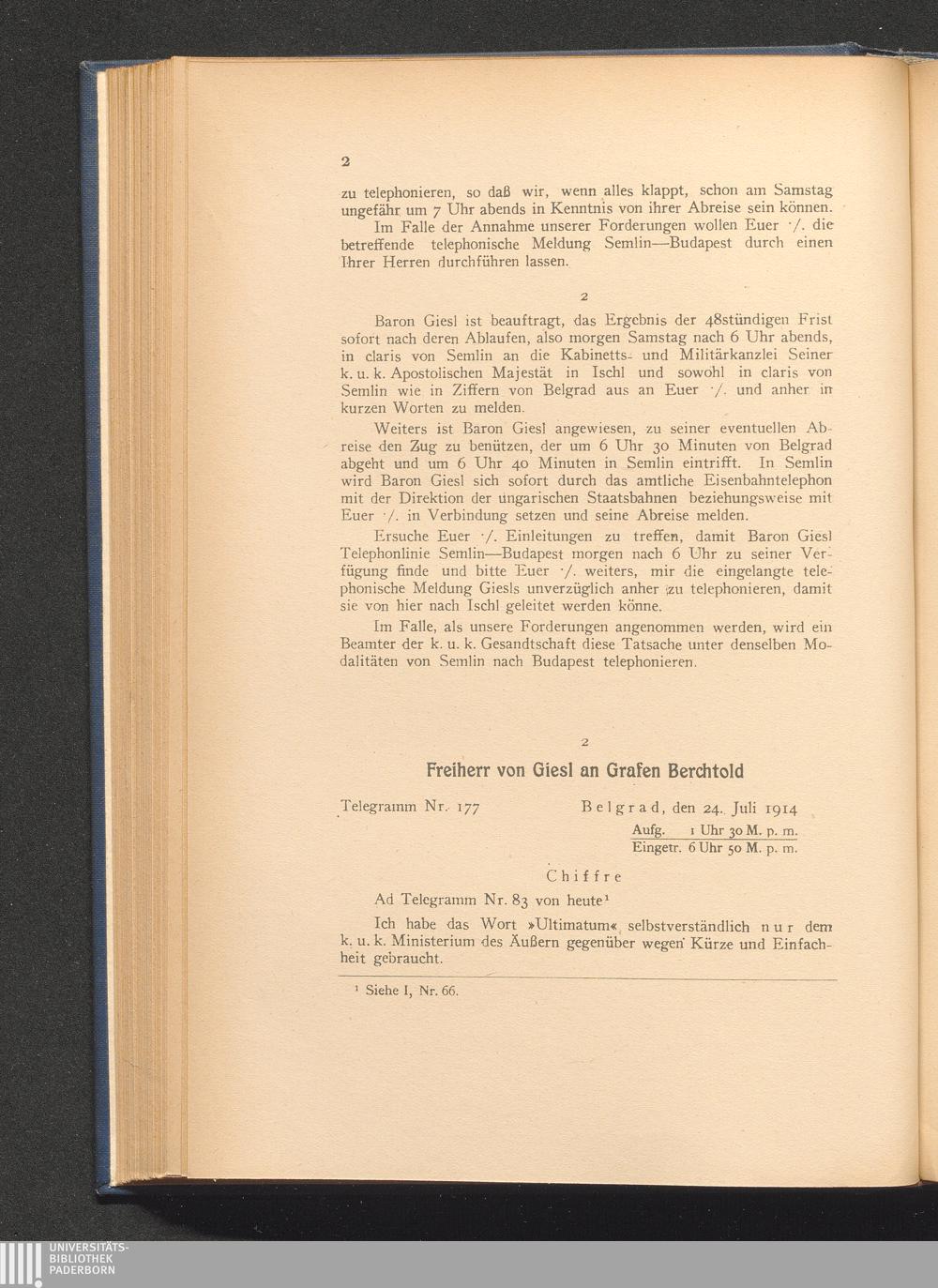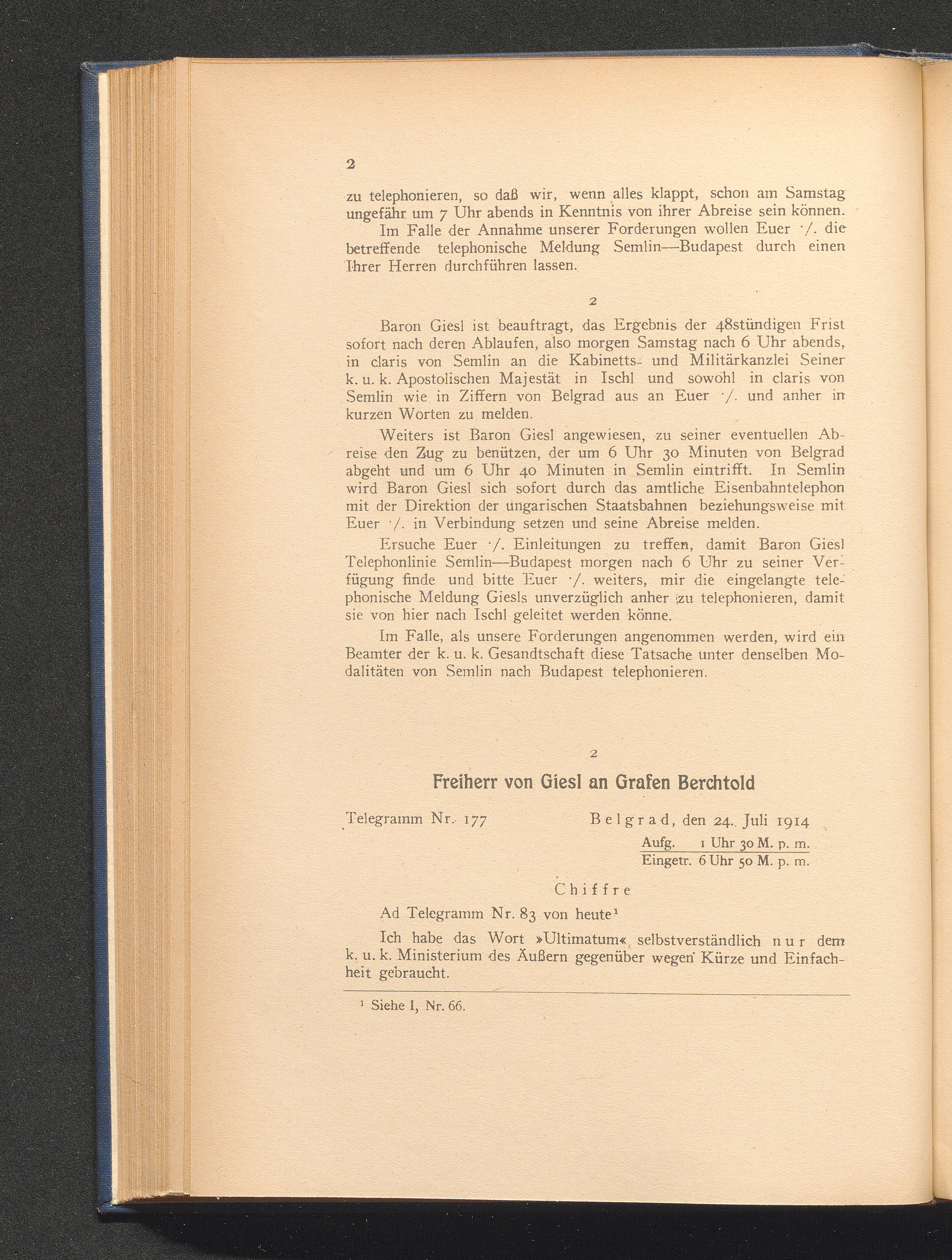 2. Belgrad, den 24. Juli 1914. Freiherr von Giesl an Grafen Berchtold.