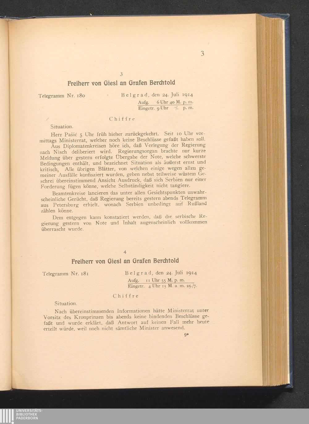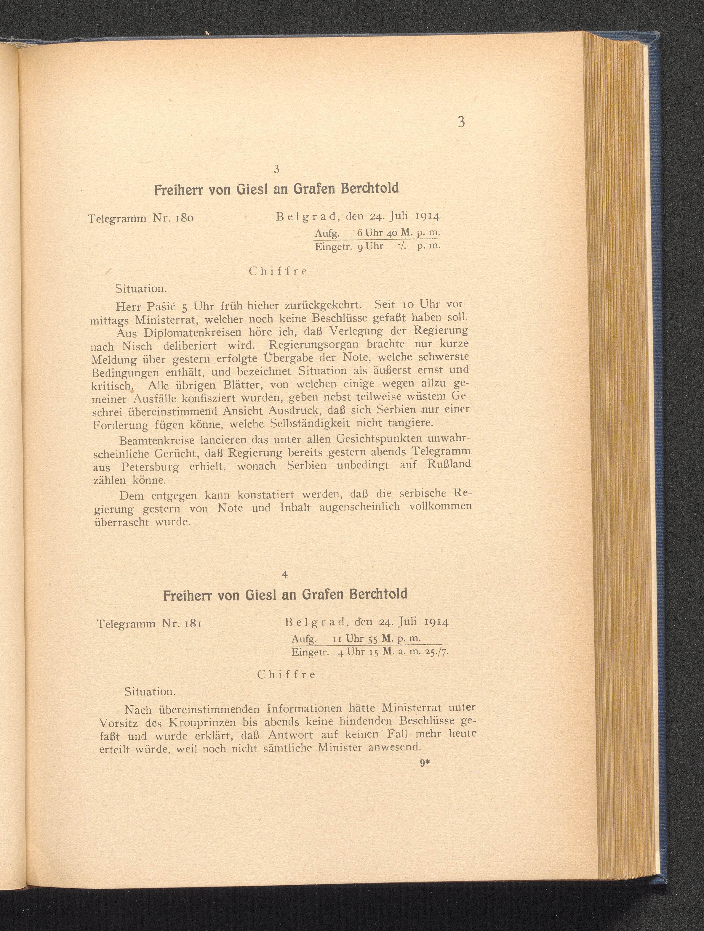 4. Belgrad, den 24. Juli 1914. Freiherr von Giesl an Grafen Berchtold.