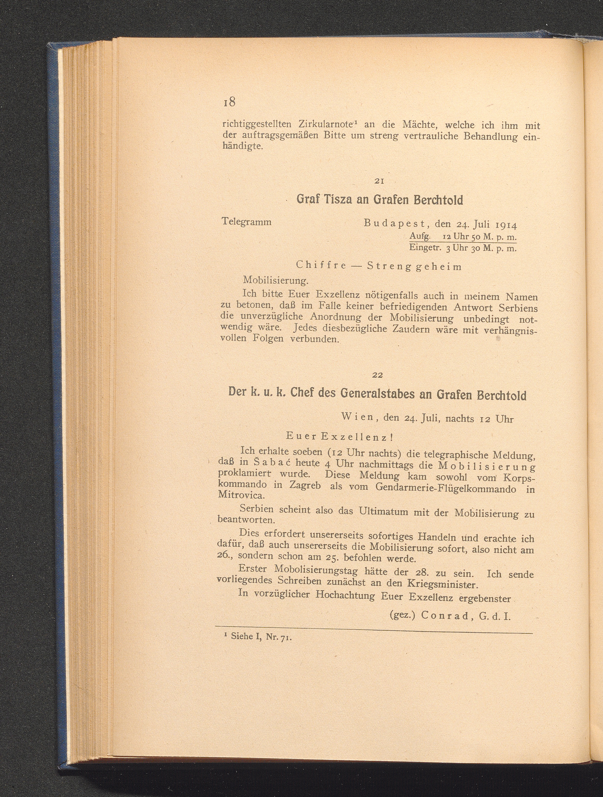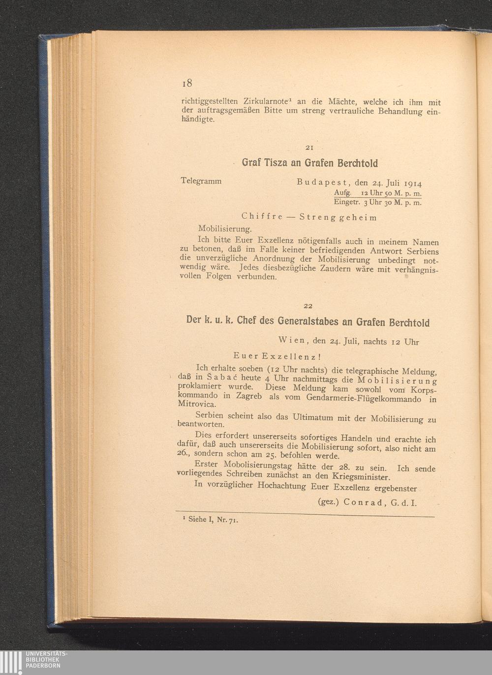 22. Wien, den 24. Juli, nachts 12 Uhr. Der k. u. k. Chef des Generalstabes an Grafen[...]
