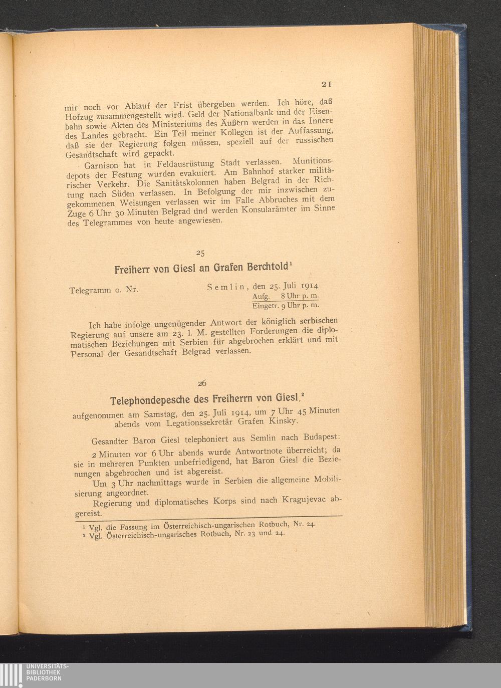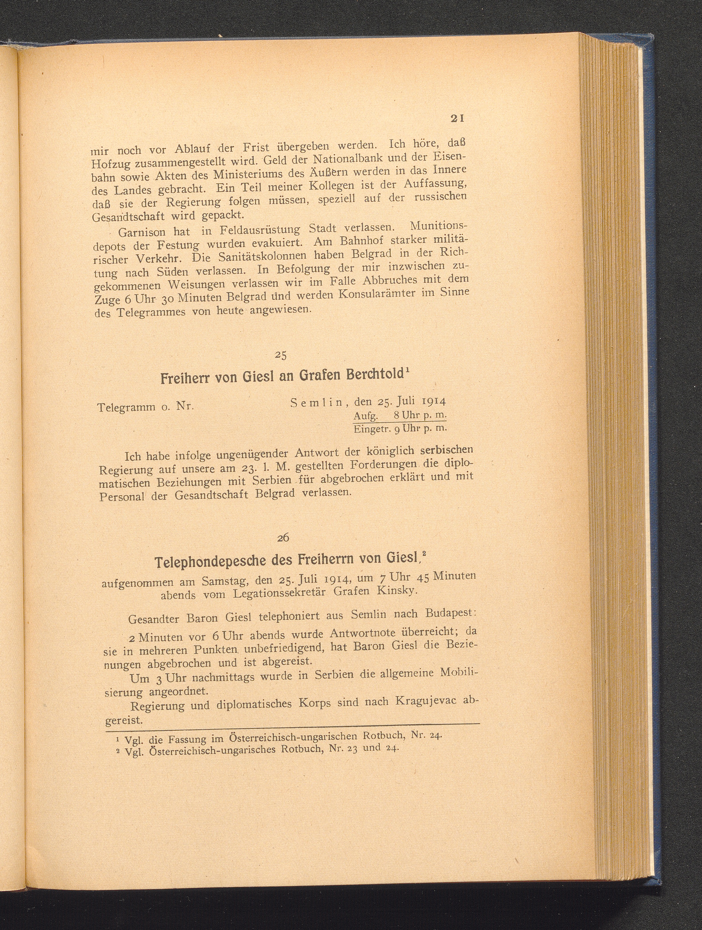 26. Wien, den 25. Juli 1914. Telephondepesche des Freiherrn von Giesl.