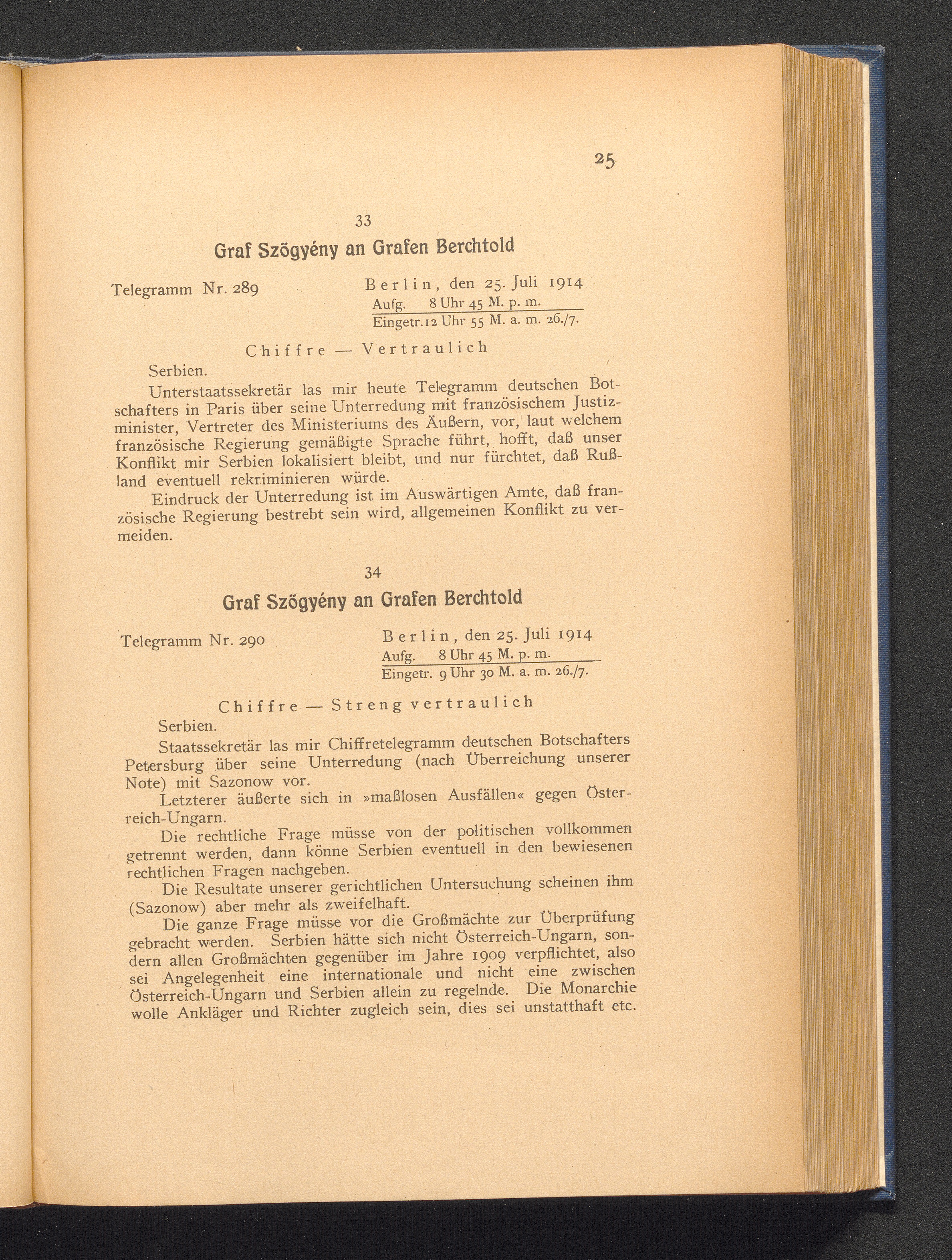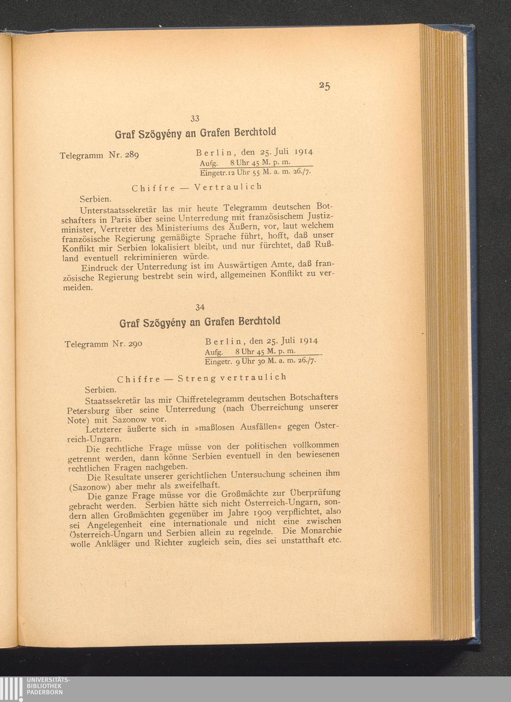 34. Berlin, den 25. Juli 1914. Graf Szögyény an Grafen Berchtold.