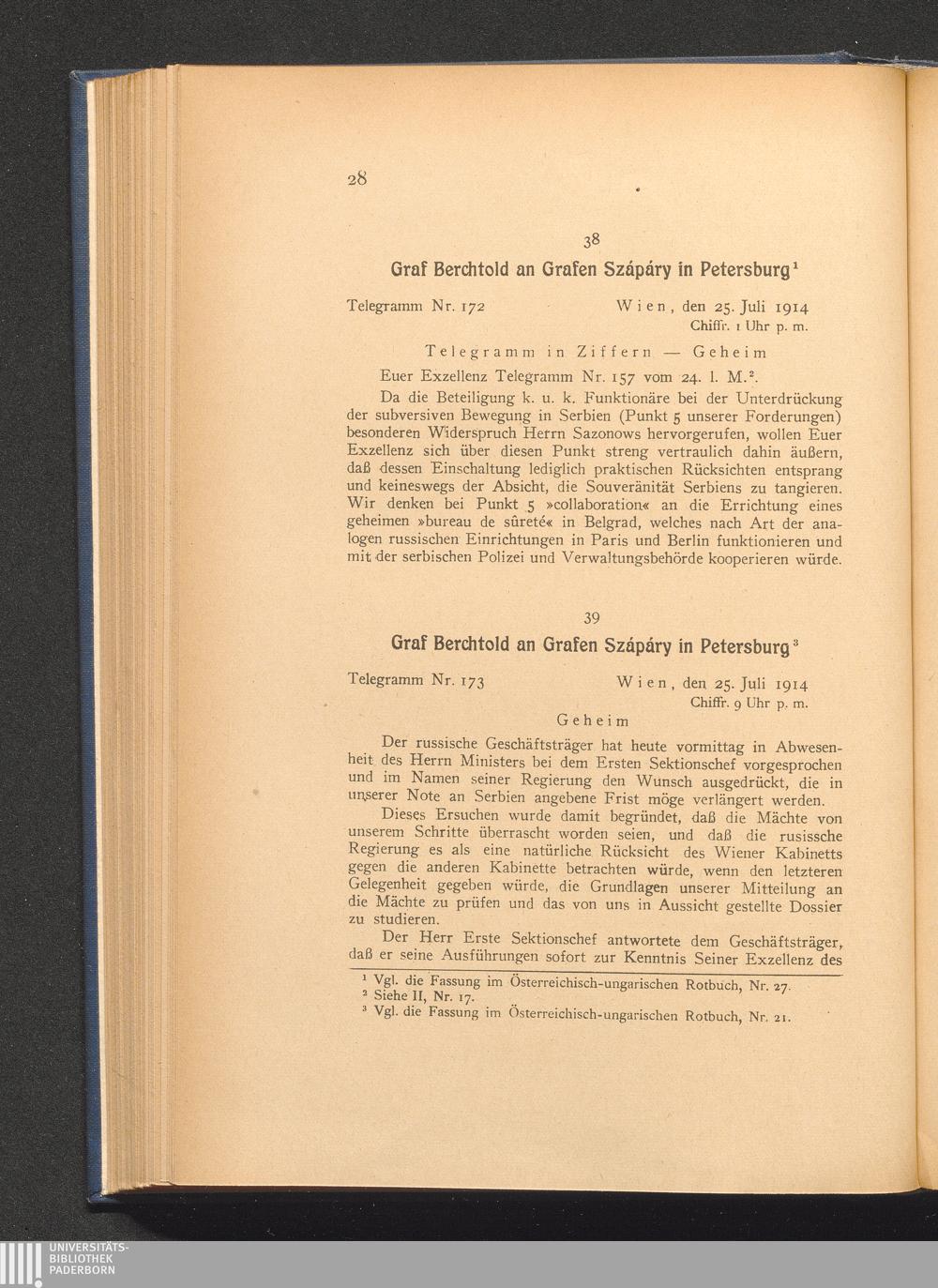 39. Wien, den 25. Juli 1914. Graf Berchtold an Grafen Szápáry in Petersburg.