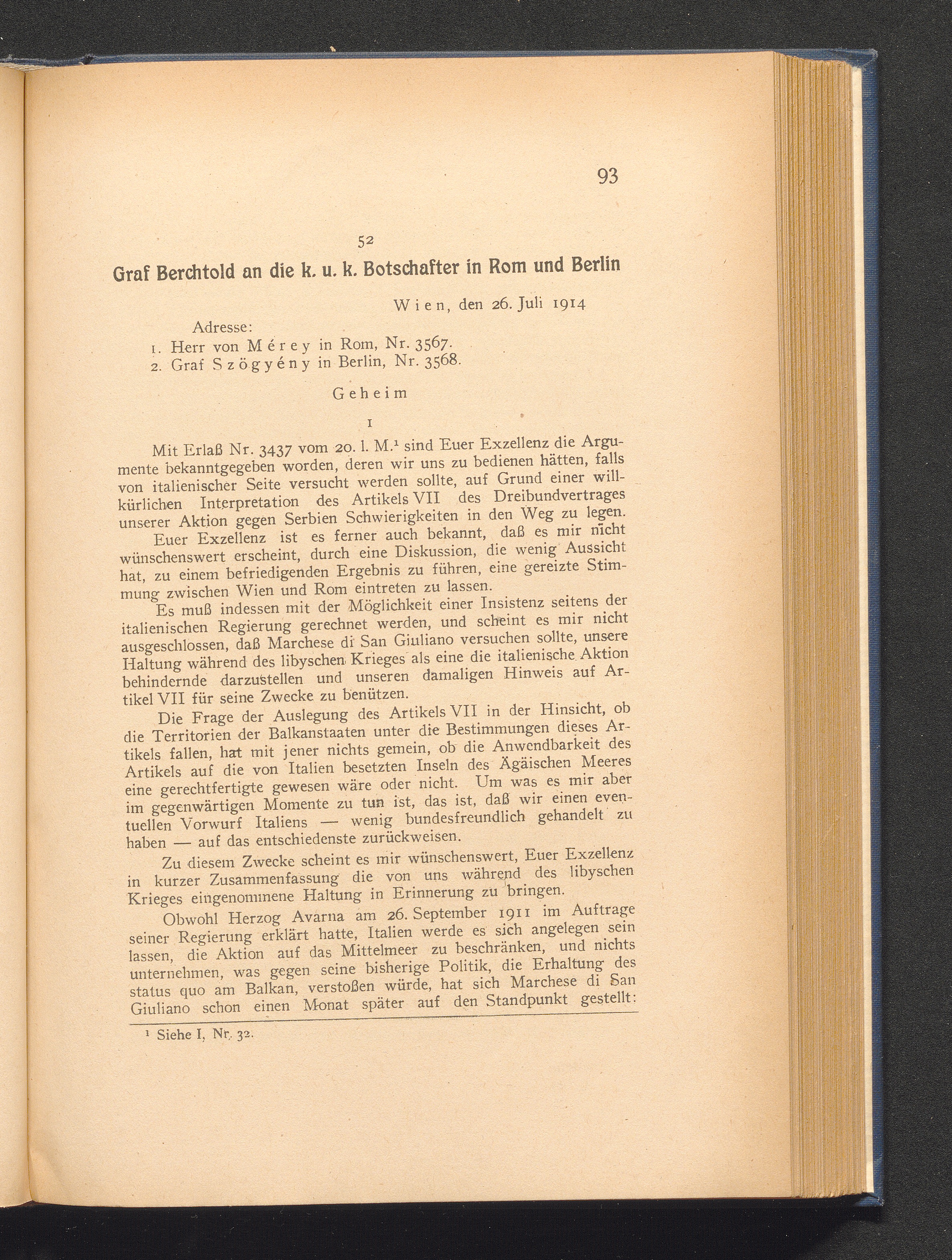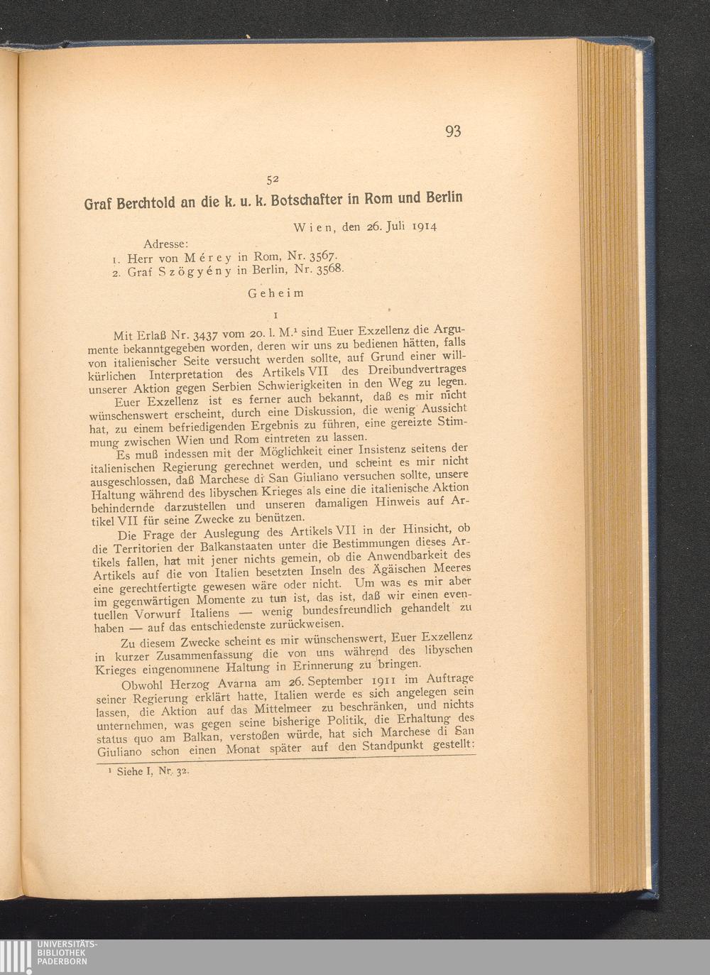 52. Wien, den 26. Juli 1914. Graf Berchtold an die k. u. k. Botschafter in Rom und[...]