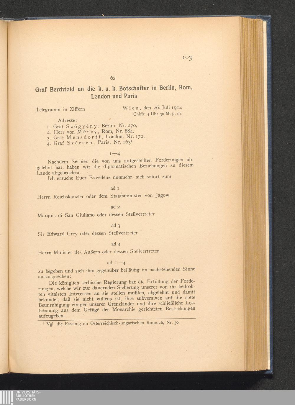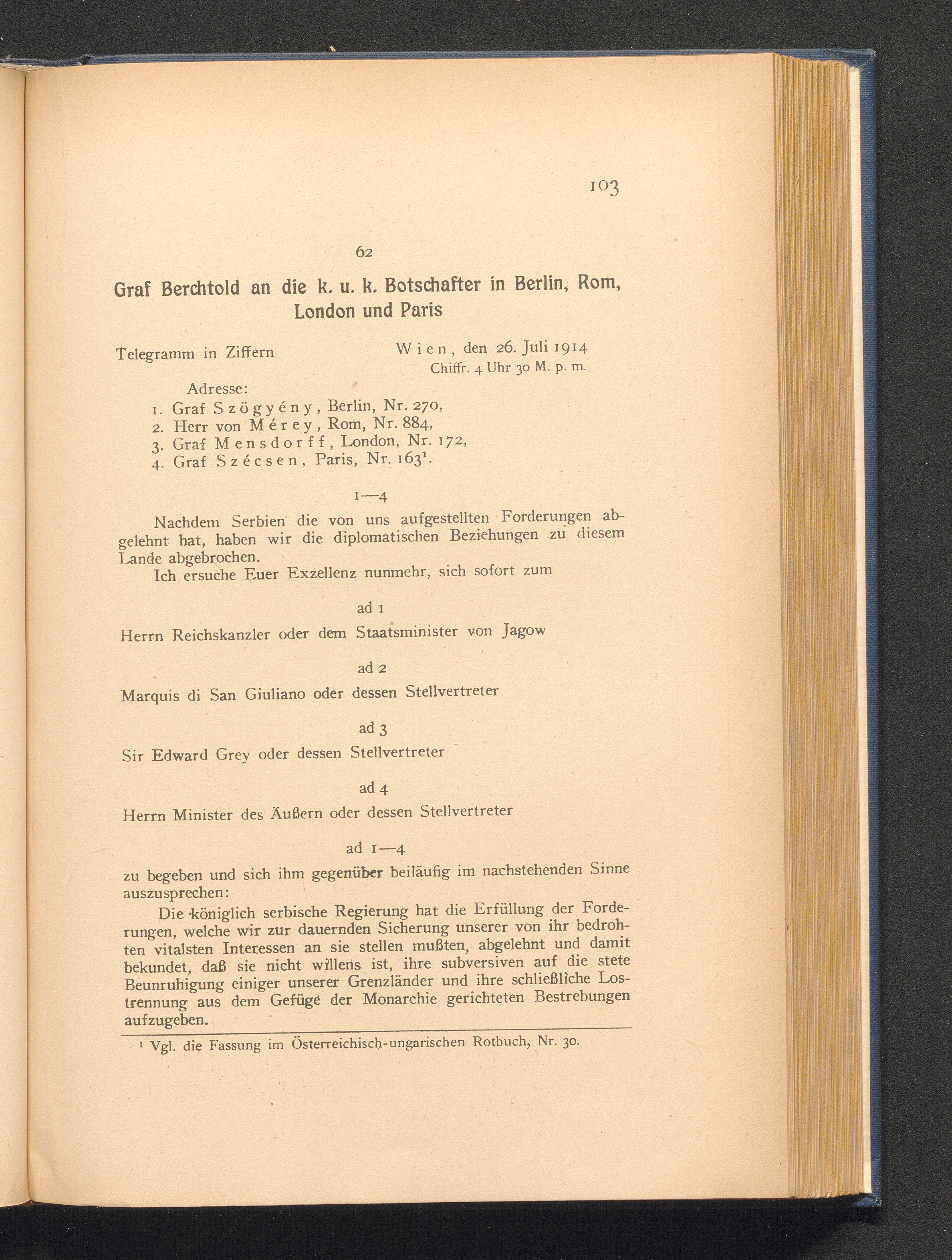 62. Wien, den 26. Juli 1914. Graf Berchtold an die k. u. k. Botschafter in Berlin,[...]